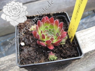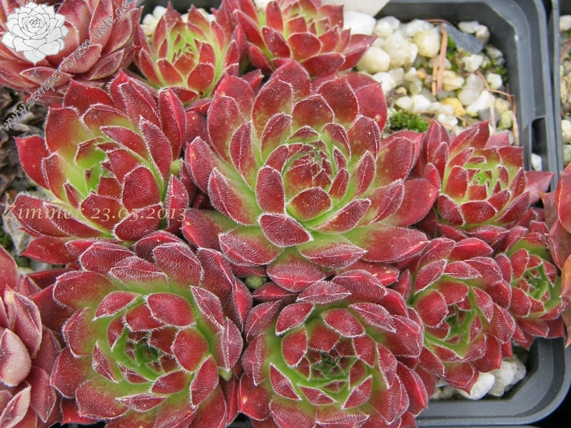'Pruhonia' - Behaarte mittelgroße Rosetten die im Frühling ein leuchtendes Purpurrot mit hellgrüner Basis zeigen. Die Pflanze hatte Frau Helen E. Stein-Zeppelin aus Tschechien mitgebracht. Auch als 'Pruhonice' und 'Zeppelin No. 3' verbreitet.
