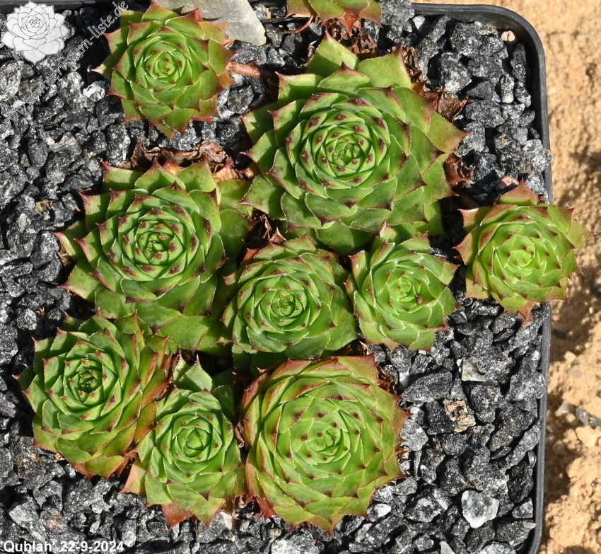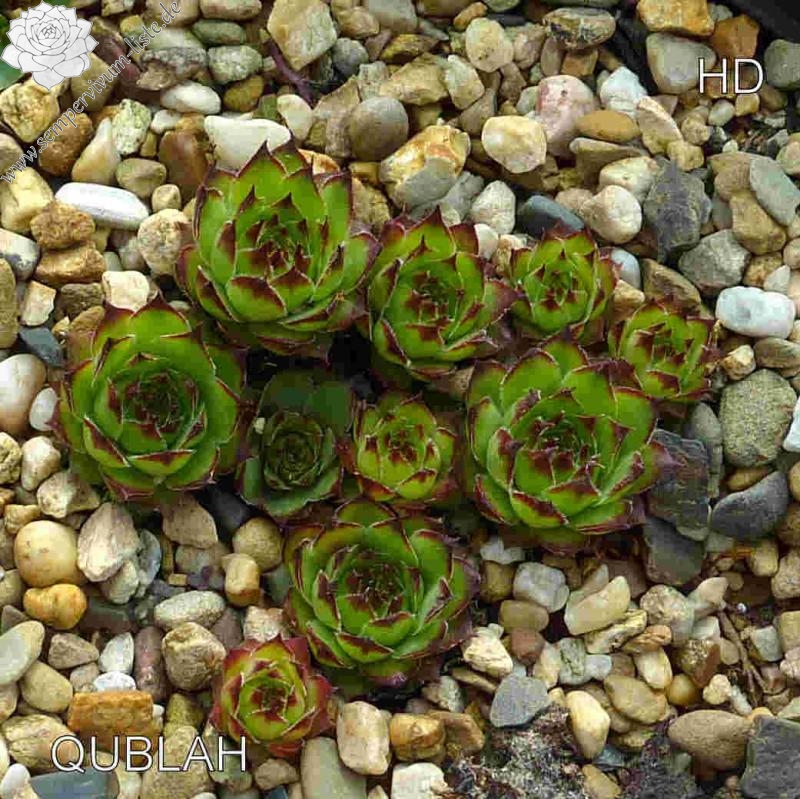 Sempervivum 'Qublah' ist eine neuere, sehr leuchtende Hauswurz-Züchtung. Die größeren, grünen Rosetten besitzen intensiv leuchtende Blattspitzen. Die breiten Blätter stehen fast senkrecht nach oben.