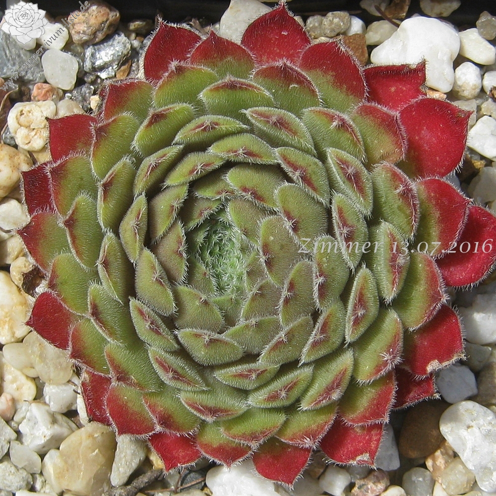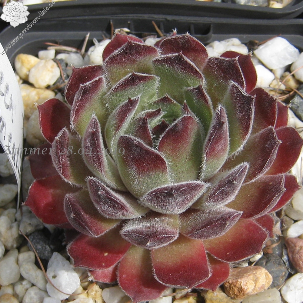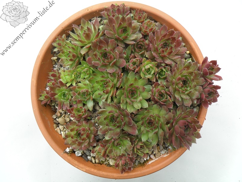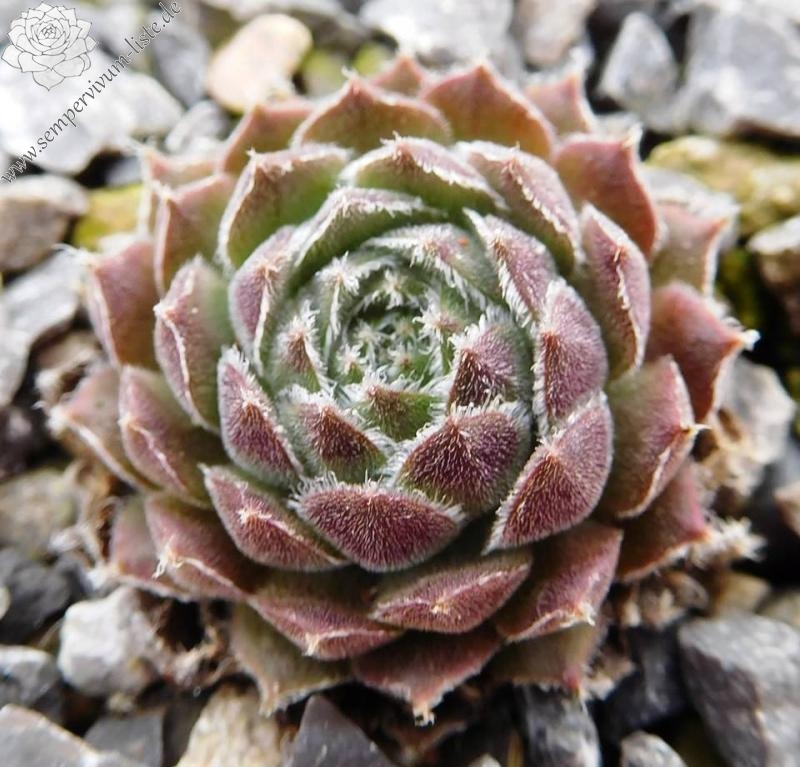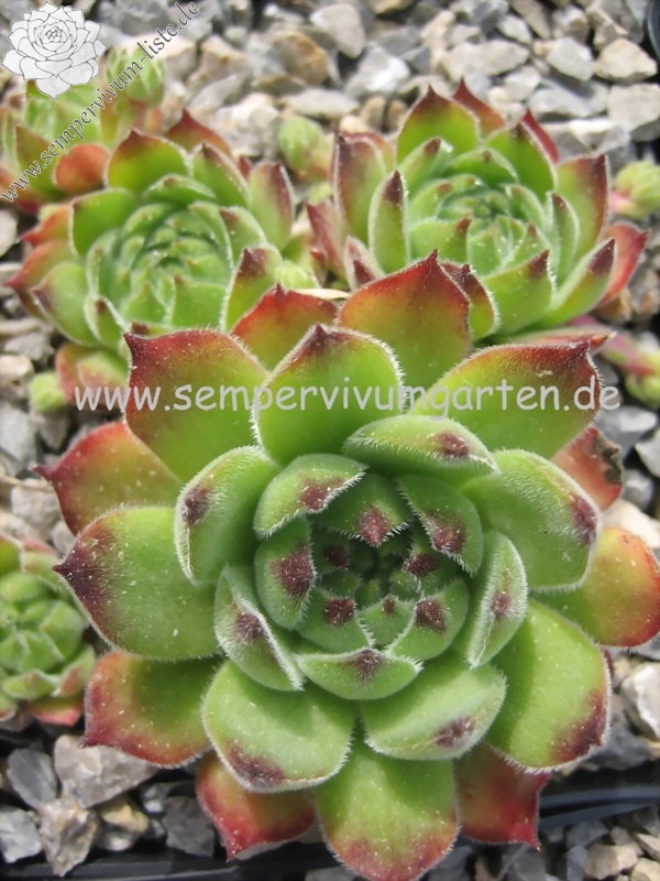Diese amerikanische Hybride formt mittelgroße hellolivgrüne Rosetten mit rotbraunen Spitzen an denen kleine Watte ähnliche Tuffs sitzen.