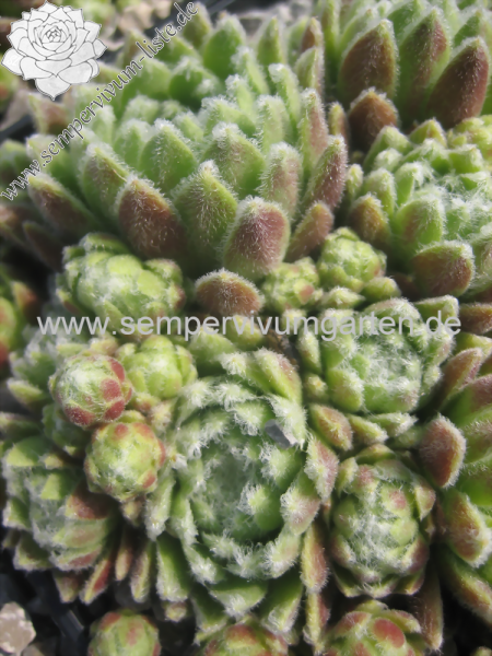 Es ist ein kugeliger Typ mit samtenem und stark weiß behaartem Laub. An den Blattenden sitzen dichte weiße Büschel. Die Rosetten sind etwas größer als bei den meisten anderen Spinnwebhauswurzen.