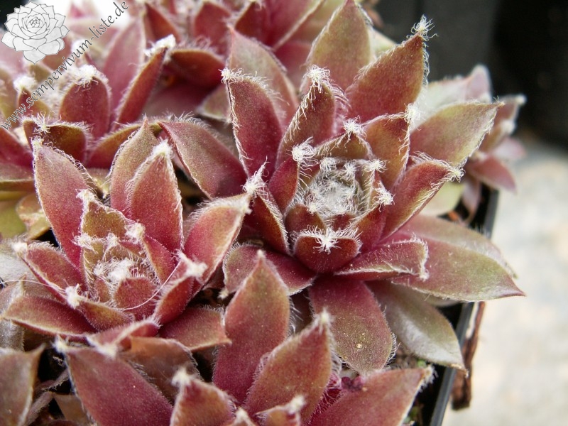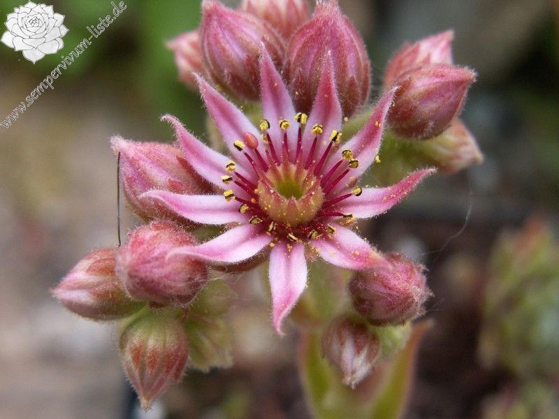 purpurrote Rosetten, mittelgroß, stark bewimpert, weiß übersponnen, Blüte rosa, Höhe 15 cm