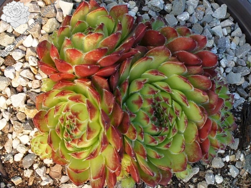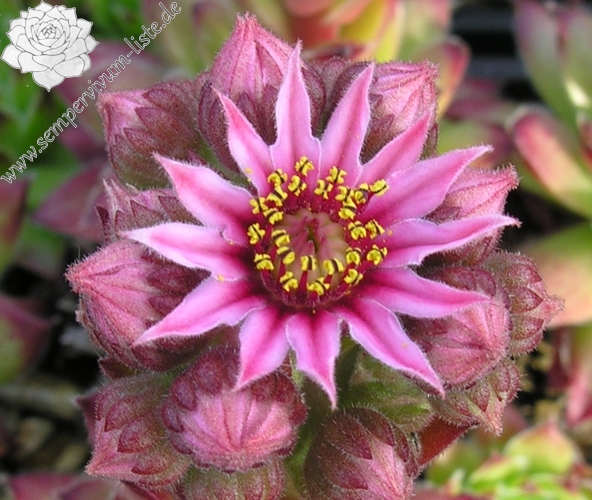 ca 5 cm große, flache Rosetten, hellgraugrün, Blattspitzen hellrot, Ränder bewimpert, im Winter purpur, Blüte lachsrosa, Höhe 15 cm