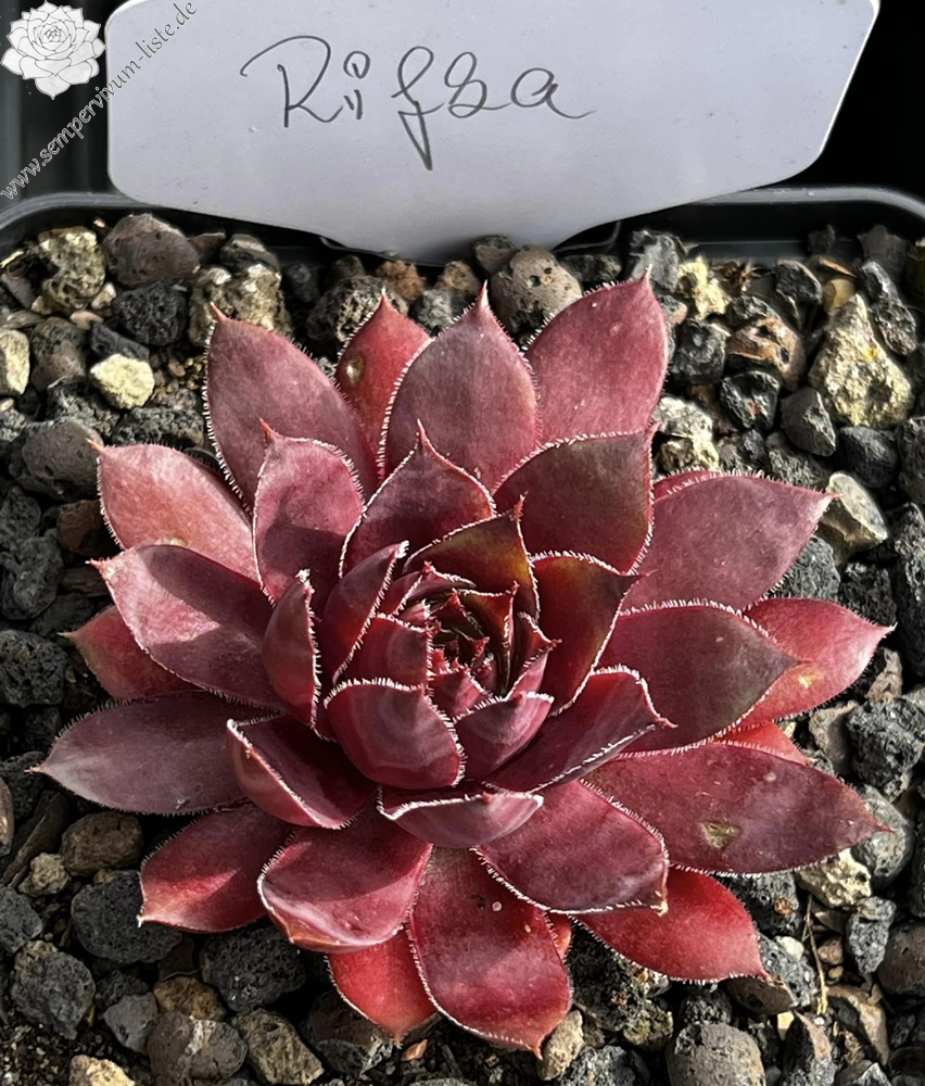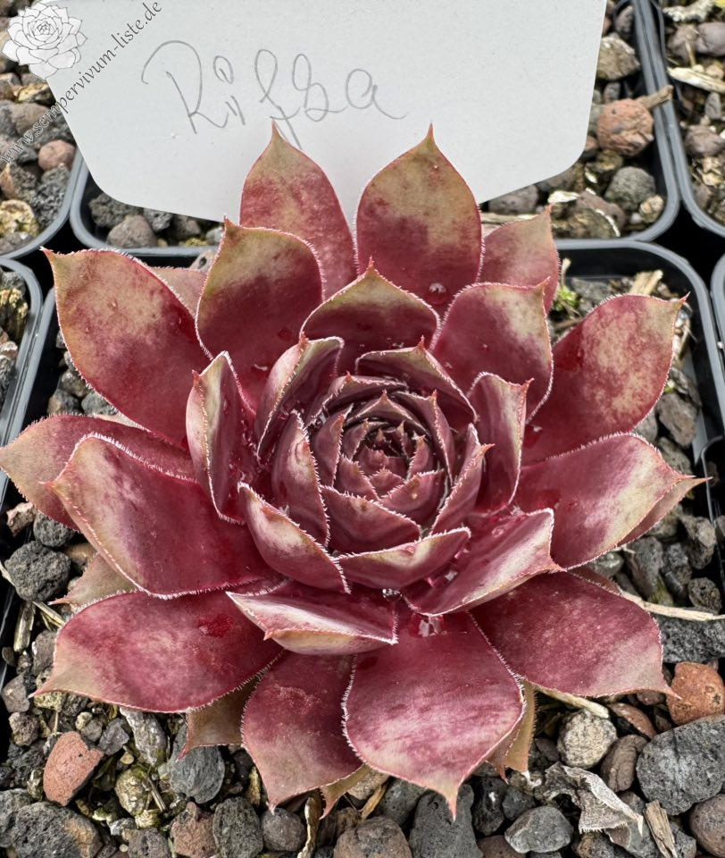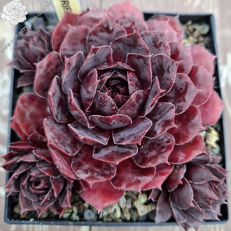 Große Rosetten, bestehend aus einer Kombination von Rottönen, Violett und Terrakotta. Die Farben variieren im Laufe des Jahres. Gelegentliche Wasserzeichen. Behält die Farbe in allen Monaten des Jahres. Im Wachstumszeitraum leuchtend in der Farbe und im Herbst und Winter dunkel.
