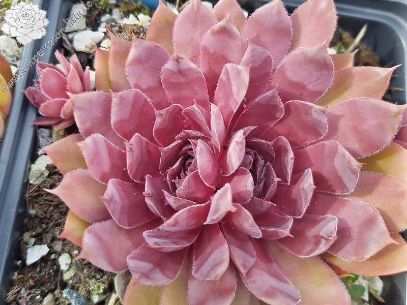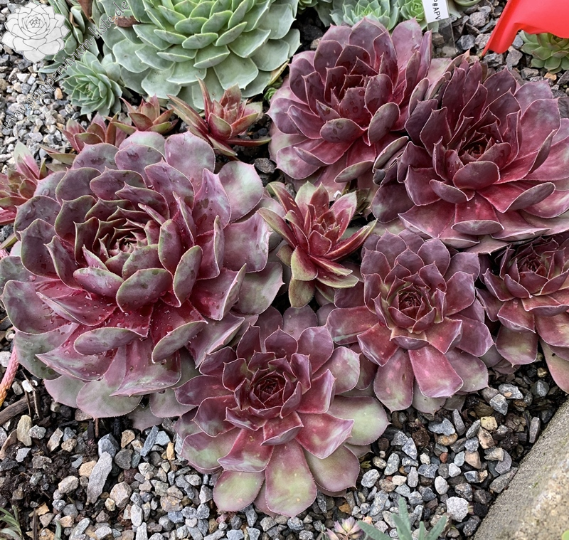 Large rosettes made up of a combination of shades of red, purple and terracotta. Colors vary throughout the year. Occasional watermarks. Keeps color in all months of the year. Bright in color during the growing season and dark in the fall and winter.