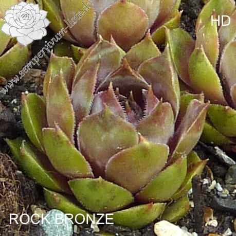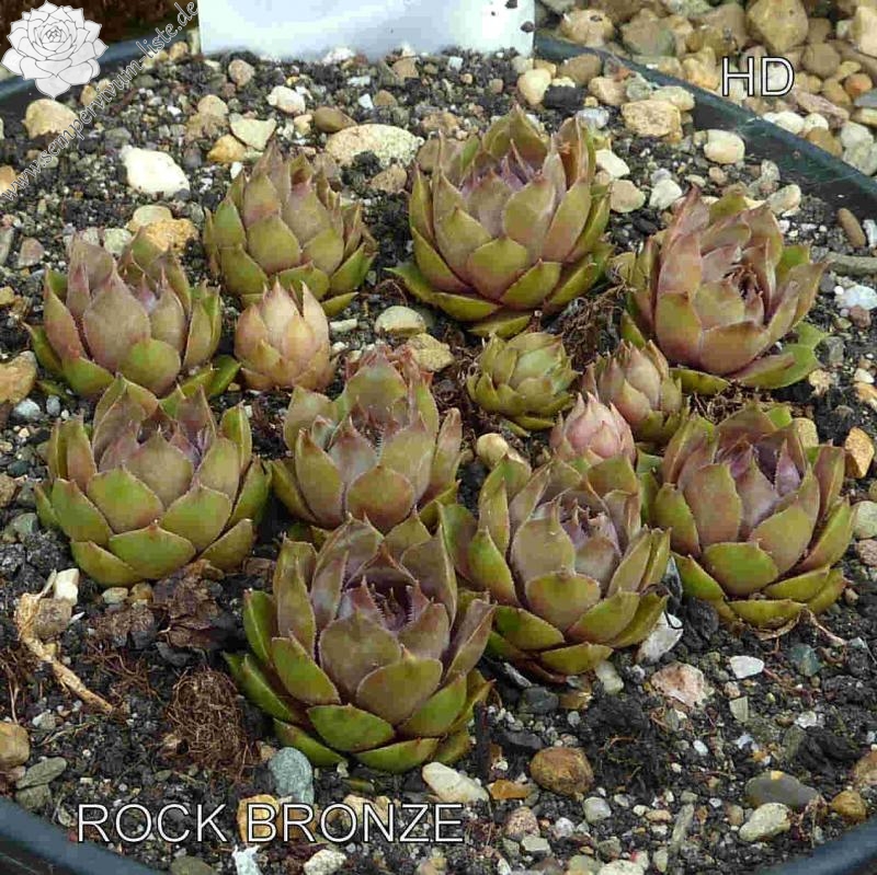 Eine ältere, sehr bunt wirkende Züchtung. Die manchmal auch 'Rock Bronce’ geschrieben wird. Die roten Blattenden leuchten im Sommer sehr intensiv und heben sich deutlich vom Rosettenzentrum ab. Die mittelgroßen Rosetten bilden ganz dichte Polster. Eine tolle Pflanze!
