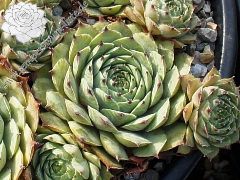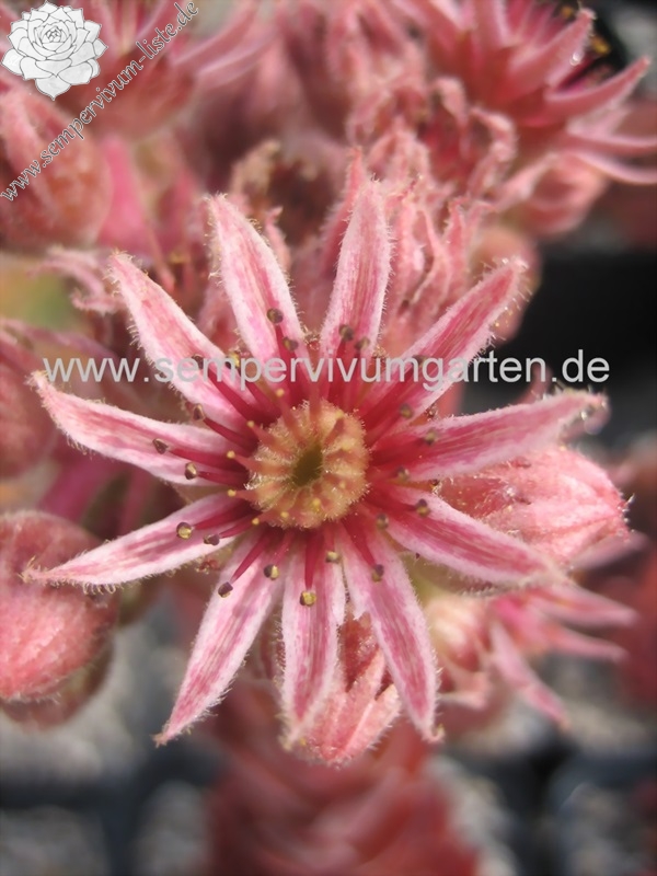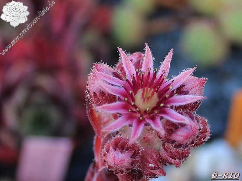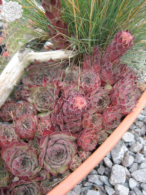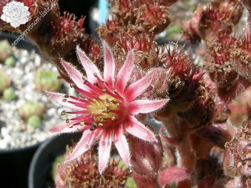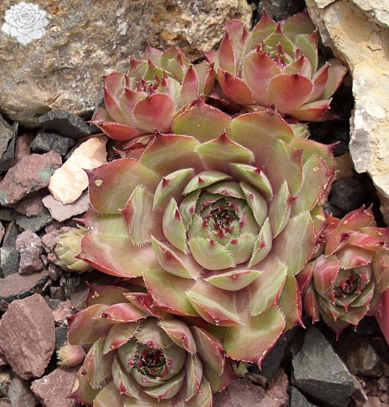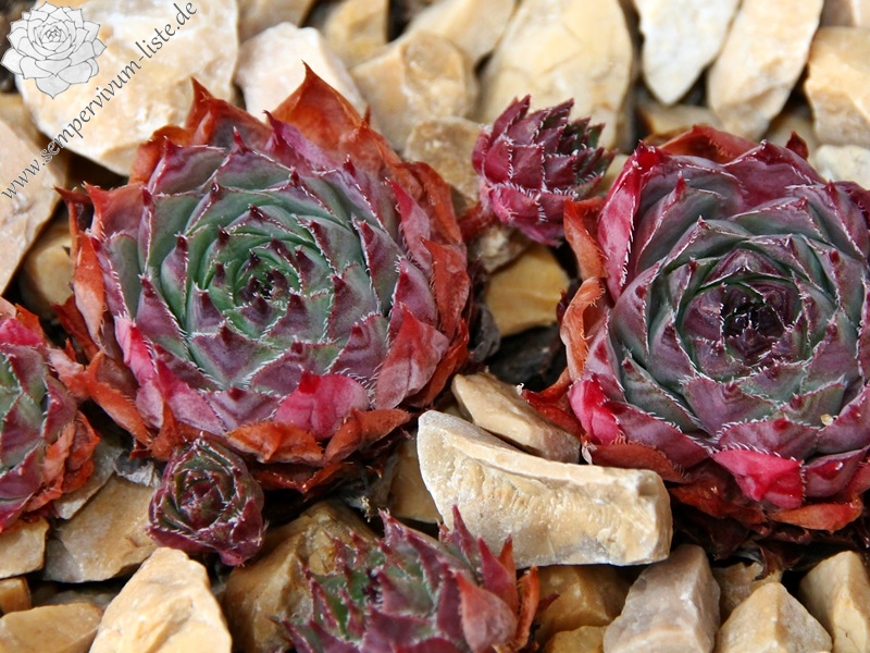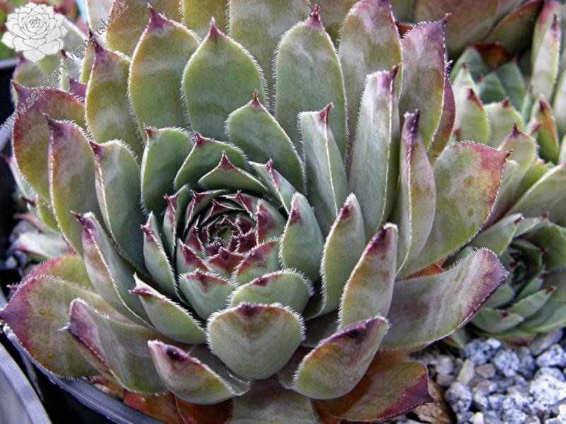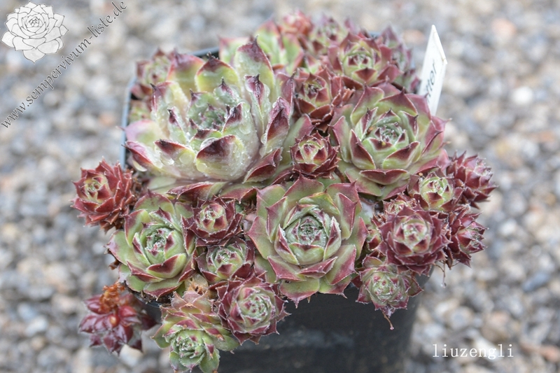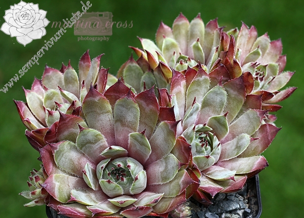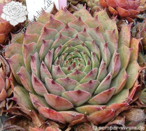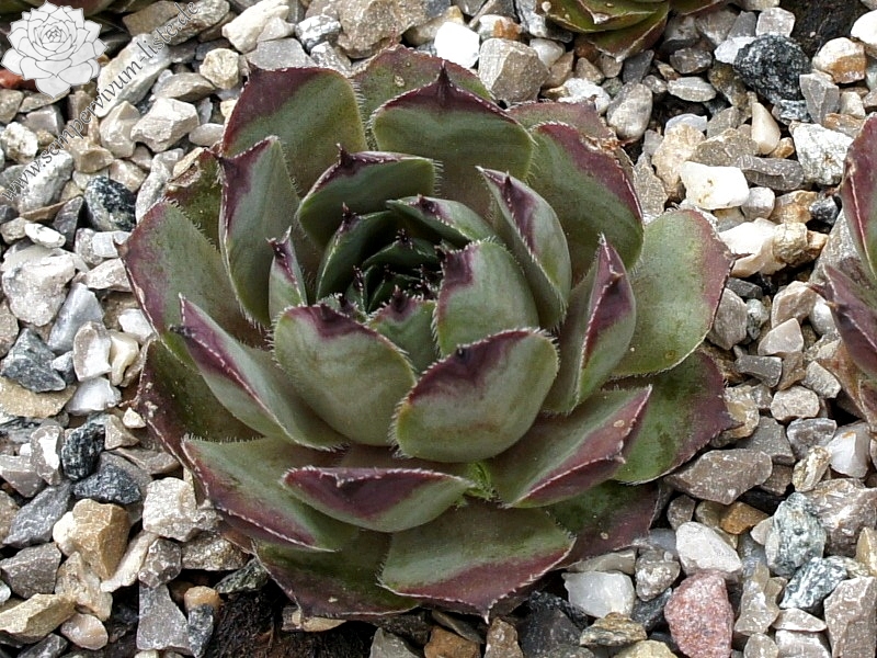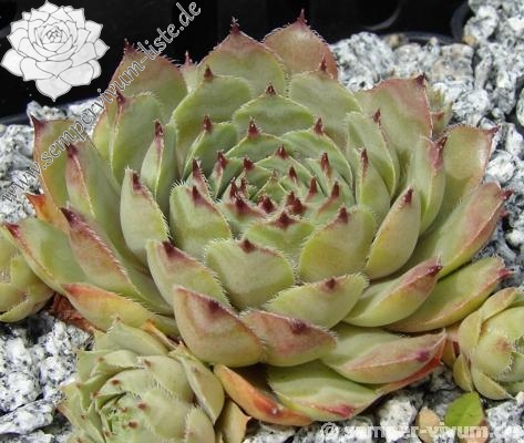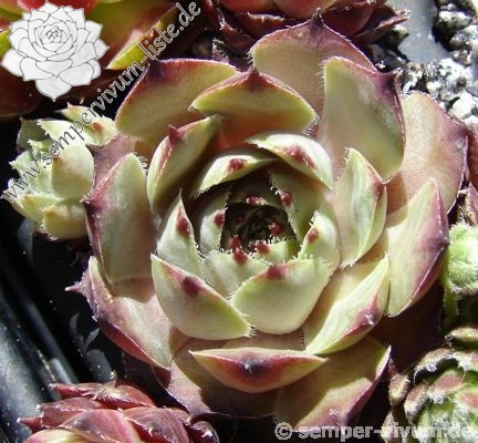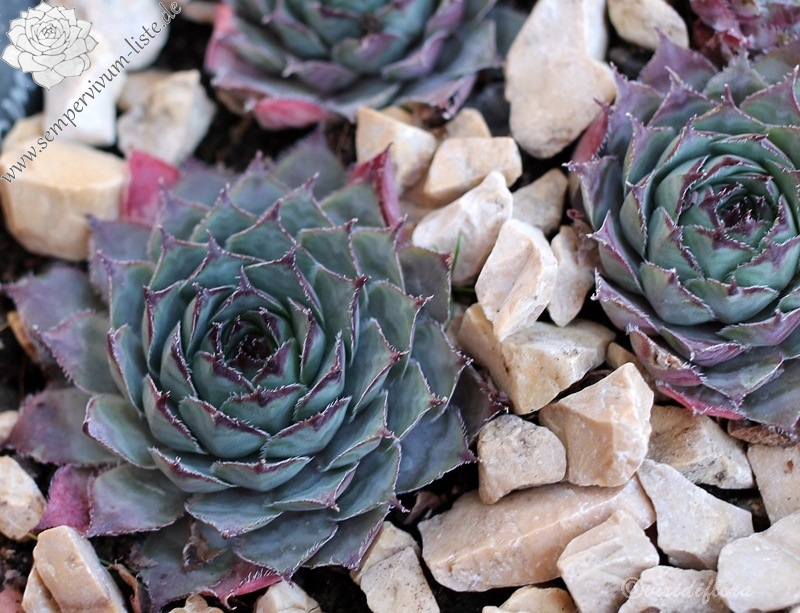 Die Mutterpflanze dieses Sämlings steht in den Sammlungen unter S. tectorum x S. calcareum. Leider hat sich gezeigt, dass sobald sich andere Formen mit S. calcareum kreuzen, das S. calcareum–Blut schnell verloren geht. Von den Sämlingen der Absaat besaßen nur sehr wenige Pflanzen noch das typische Aussehen von S. calcareum. Im Frühjahr zeigen sich die Rosetten mit einer sehr kühlen Grundfärbung. Das helle Grau wird abgerundet von helllila Blattenden, welches man von S. calcareum kennt. Besonders kräftig gefärbt sind die Blattspitzen, die ein intensives Rotlila besitzen und sich dadurch deutlich abheben. Im Sommer wird die Färbung wärmer und zeigt ein kräftiges Rosarot, mit dunkleren Spitzen. Die Rosetten können einen Durchmesser von 6 cm erreichen und sind willig sprossend. Leider nur wenige Rosetten!