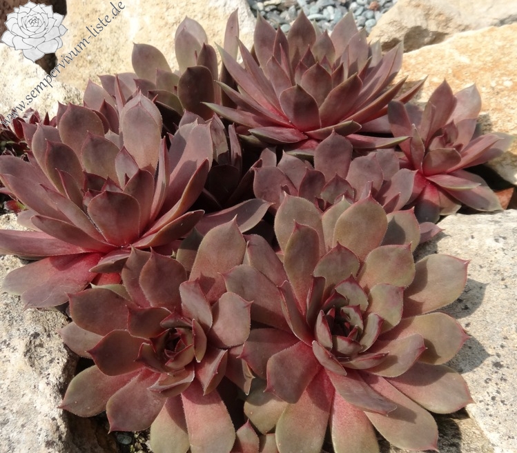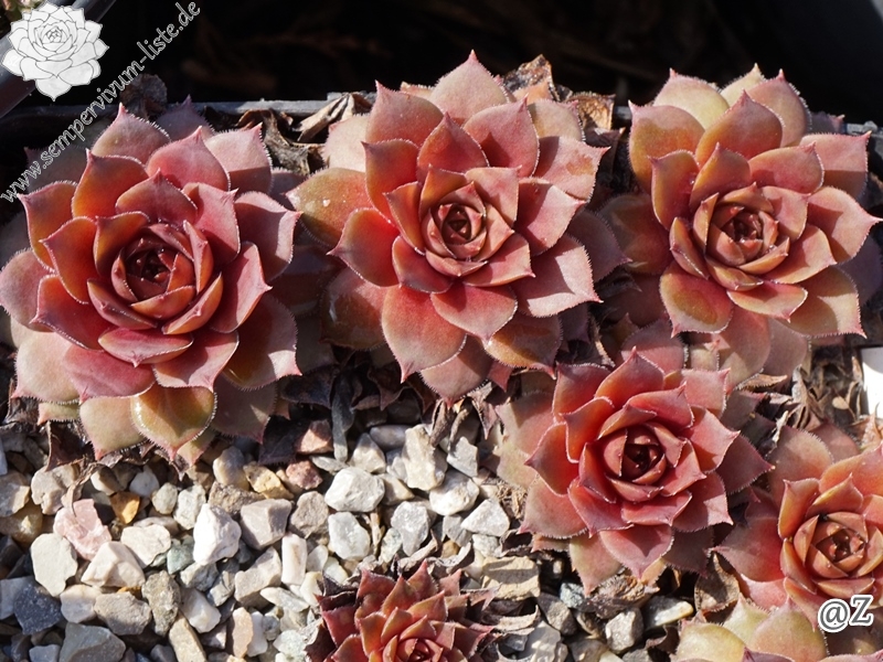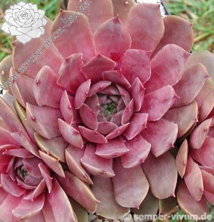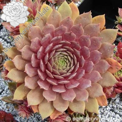 Ein Sämling von Sempervivum 'T'Boz' mit 11cm großen Rosetten in verschiedenen Rosatönen, nach außen in braun übergehend. Eine wüchsige Neuheit von 2005!