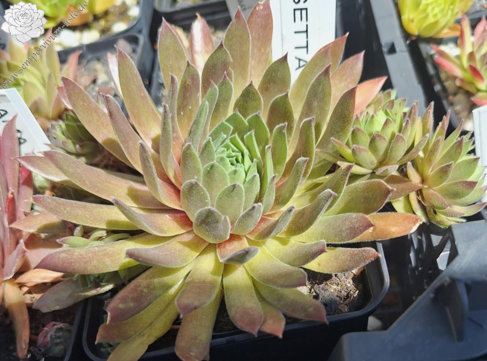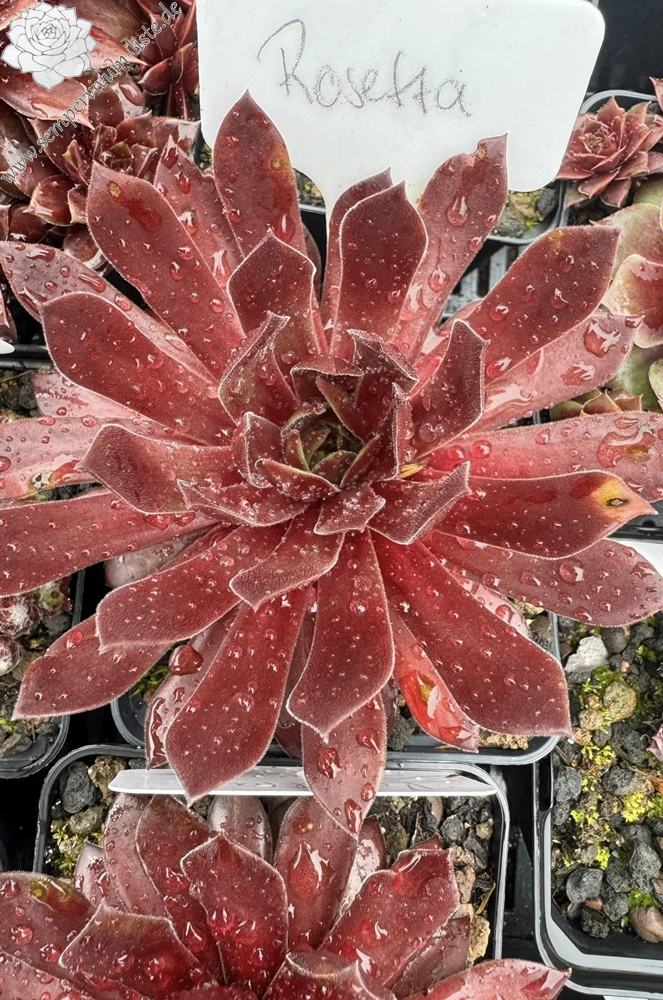 Im Frühjahr sind die zartbewimperten, samtigen Blätter von Rosetta rotbraun. Die inneren Blätter sind im oberen viertel hellgrün mit einem bräunlichen Dorn. Die Blätter um das Herz stehen fast senkrecht nach oben. Im Hochsommer zeigen die Spitzen der Rosettenblätter leuchtendes Pink, zur Basis hin werden sie heller, beigefarben mit einem dunkleren Dorn und das geschlossene Herz wird grün. Die äußeren Blätter sind pinkfarben und insgesamt nun schmäler, sie zeigen einen sehr schönen und auffälligen Farbverlauf.