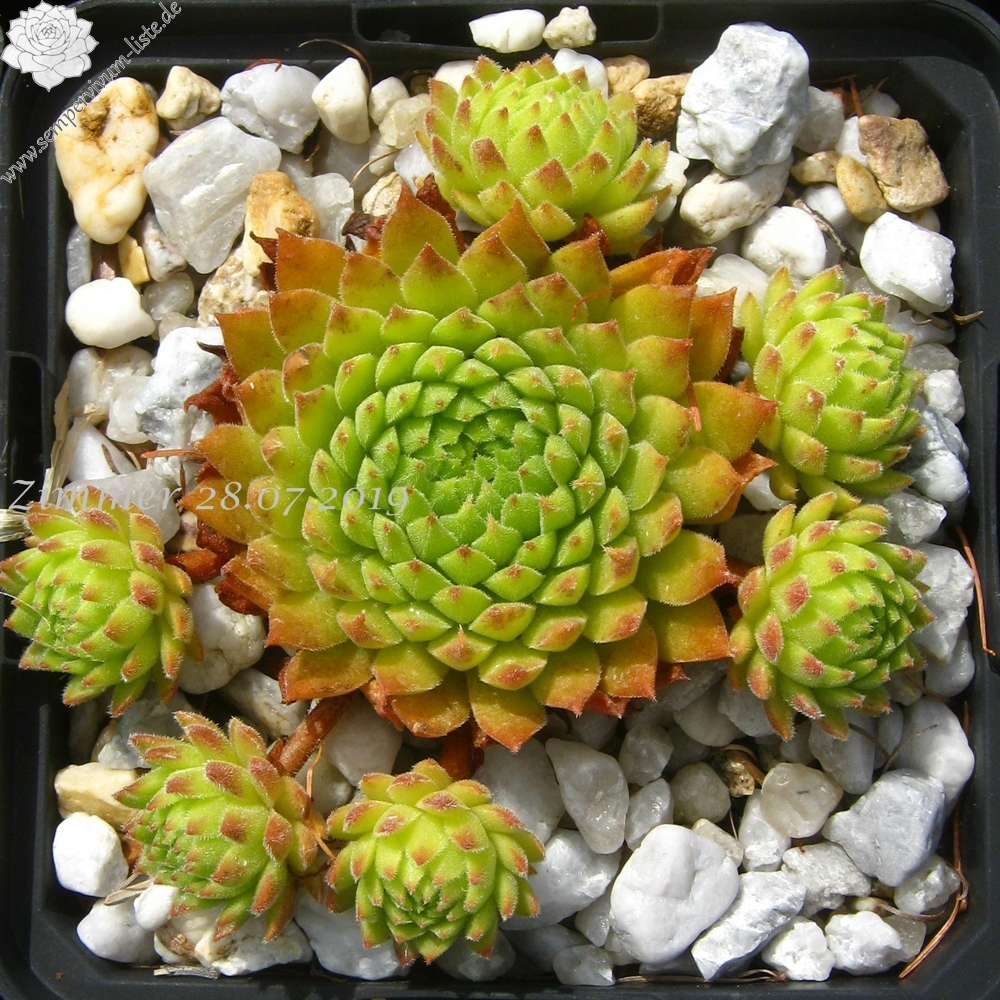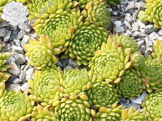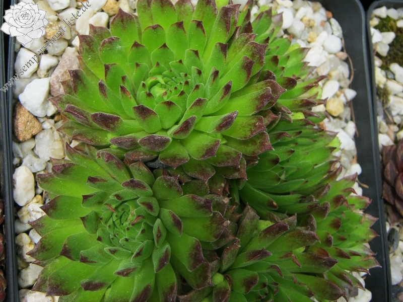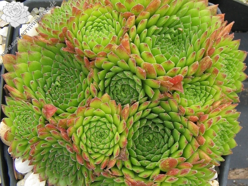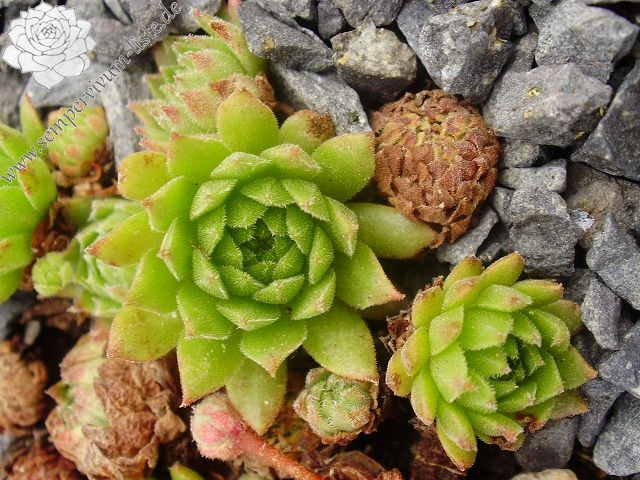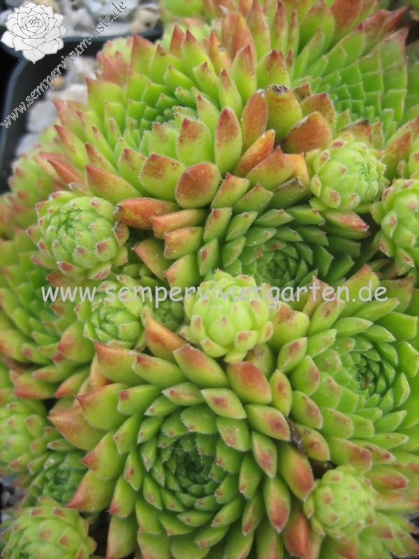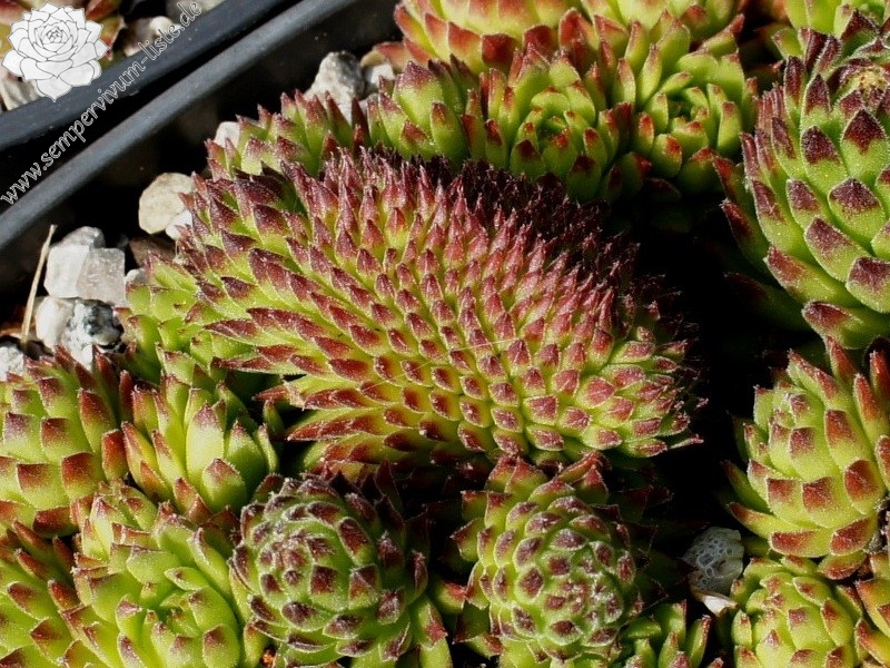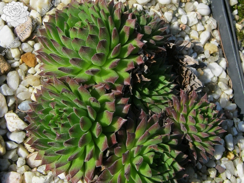 Ros. 2-3 cm, dicht, dunkelgrün, rosa Flecken, viele Ausläufer (Mont.-Hybr.)