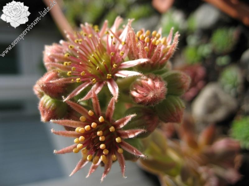 sehr große Rosetten, hellpurpurkarmin, am Grunde gelblich, bewimpert, auch im Winter tiefrot, Blüte 20 cm