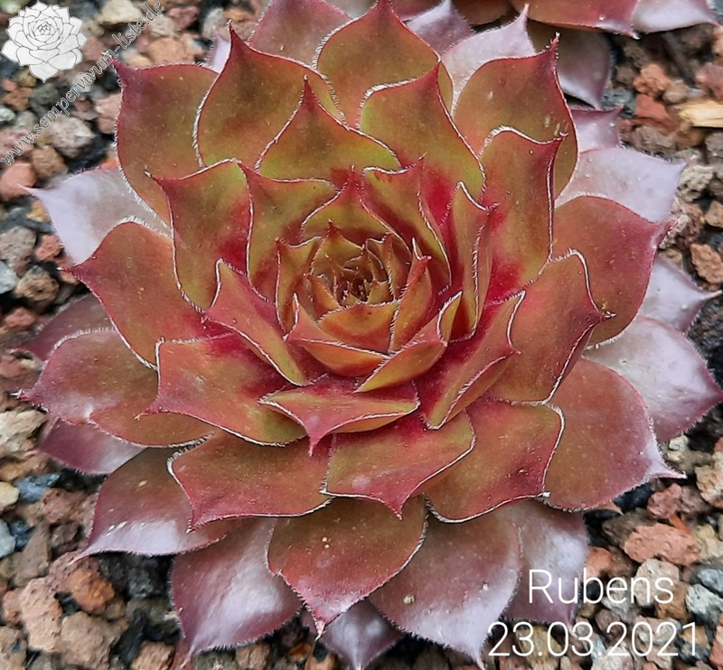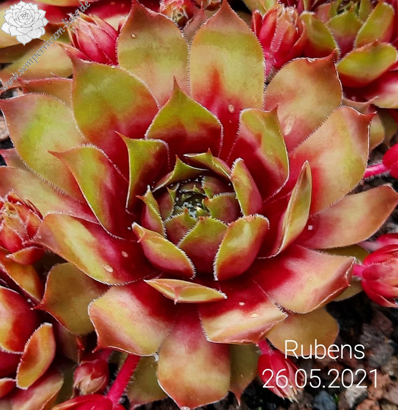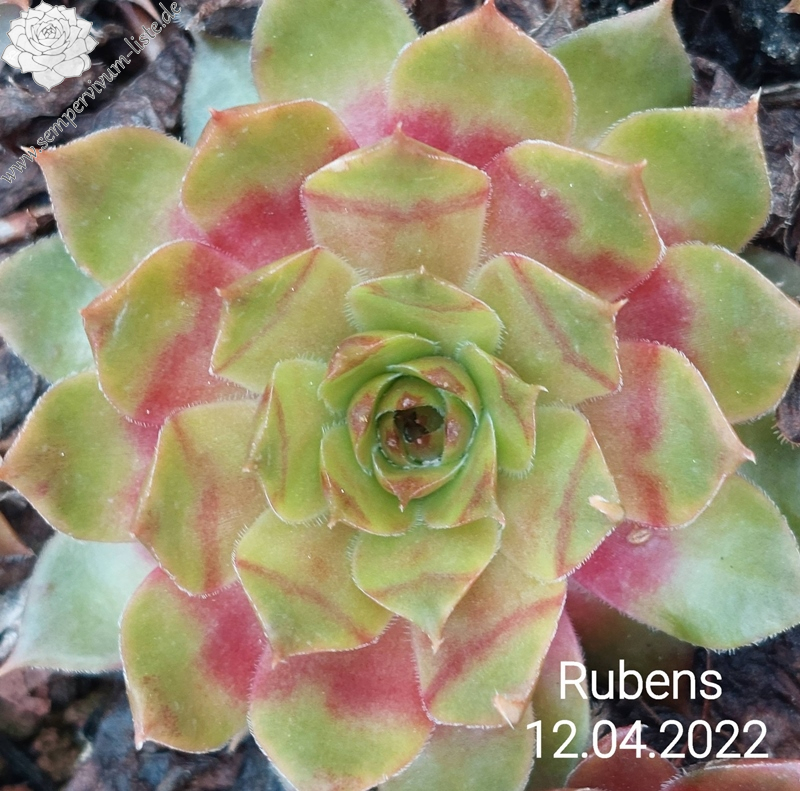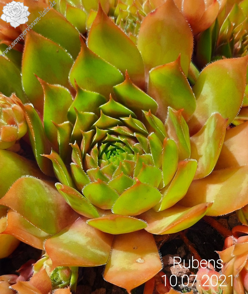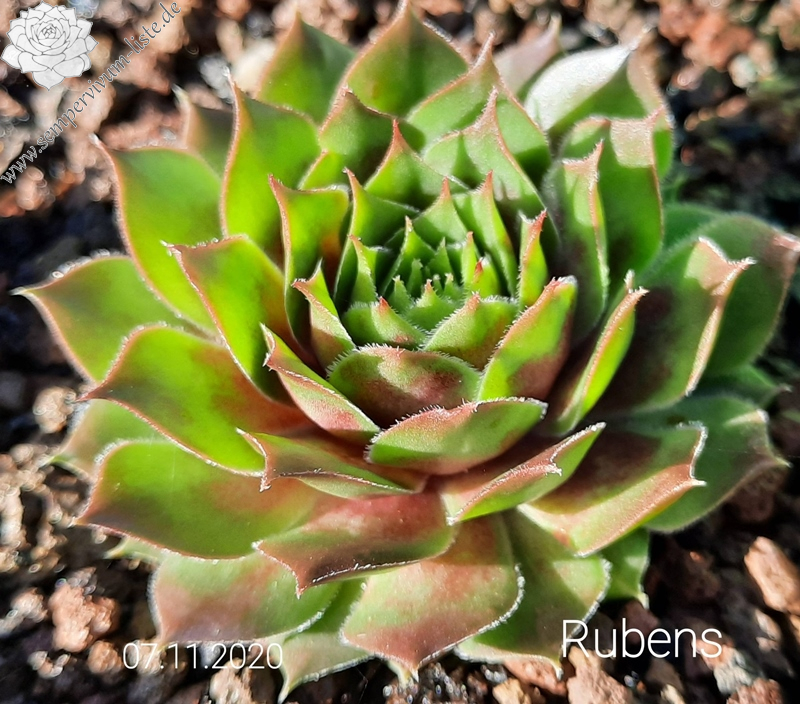 Der Kultivar stammt aus den USA und ist bislang so gut wie unbekannt: Die mittelgroßen, sternförmigen Rosetten haben eine kontrastreiche Färbung in Apfelgrün, Erdbeerot und orangefarbenem Pastell. Wir hatten schon eine ungewöhnliche Form im Sommer 2017 (s. Abb.). Bitte nicht verwechseln mit der bezaubernden, dunklen Namenssorte 'Ruben'!