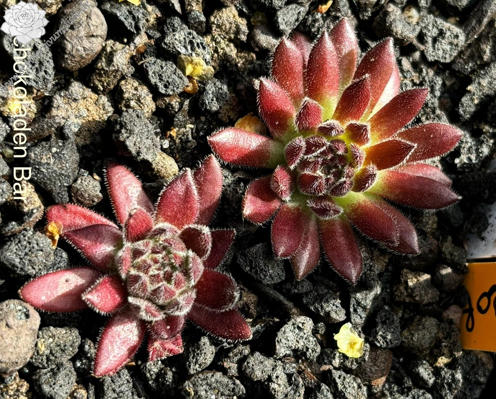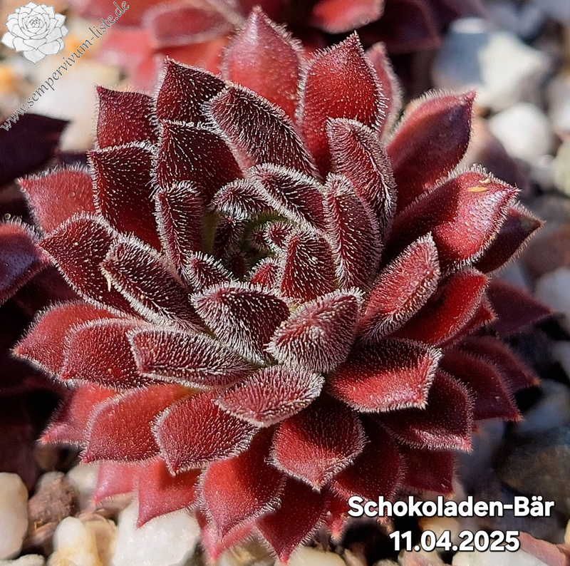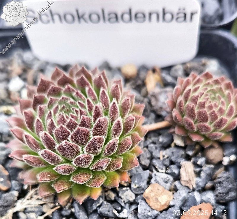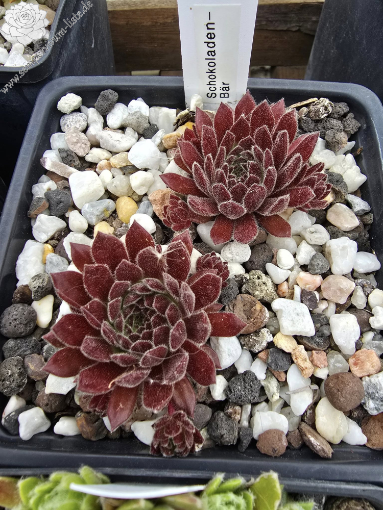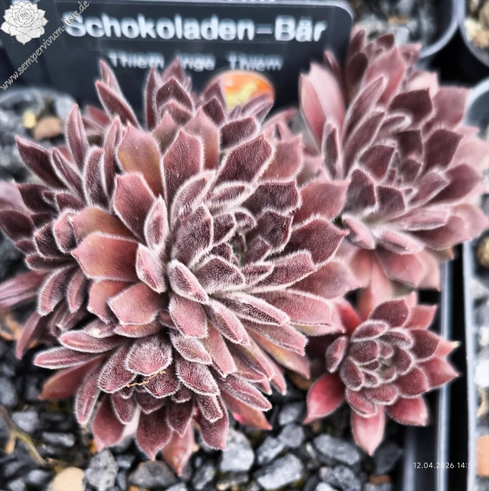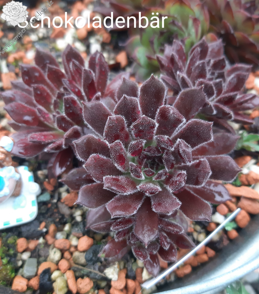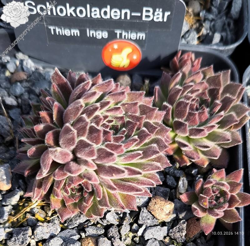 'Schokoladen-Bär' hat ein sehr plüschiges Fell auf den Blättern. Im April sind sie sehr samtig und dicht weiß behaart. Die Rosetten sind altrosa gefärbt und fast kugelig. Im Sommer wechselt der Bär das Fell zu einer tollen schokoladenbraunen Bärenfarbe.
