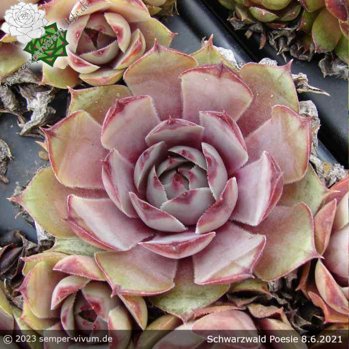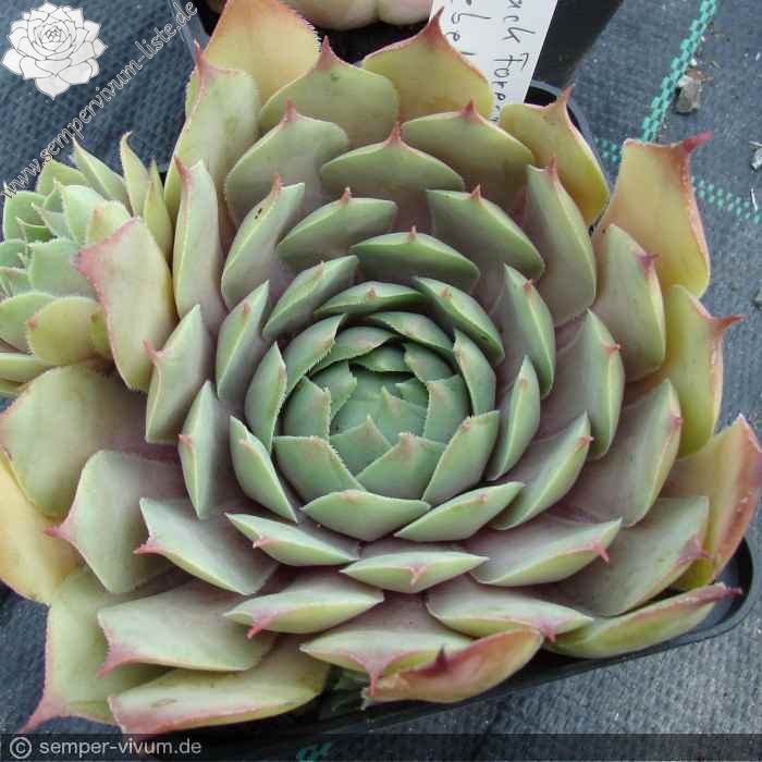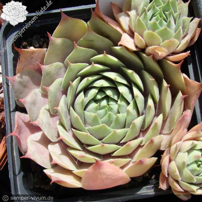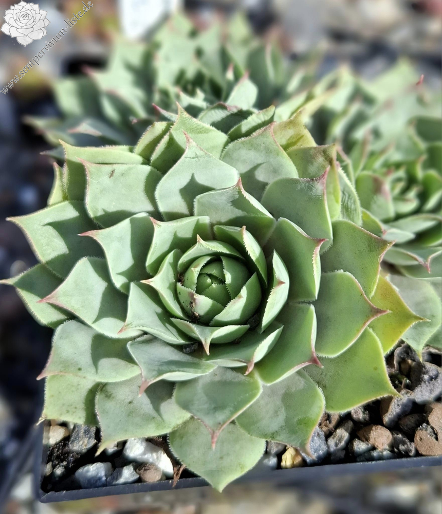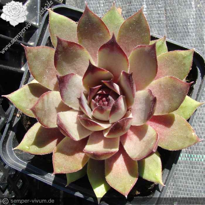 Eine neue Auslese mit recht großen Rosetten in matten Pastelltönen. Das kühle Jadegrün im Frühjahr färbt sich im Laufe des Sommer mit Leben. In dieser Übergangszeit gefällt sie uns am besten. Die anfangs zarte Einfärbung von Rosé und Lila konzentriert sich mit zunehmender Sommerhitze bis in den Blattspitzen zu einem sehr dunklen Violett. Ein anmutiger Hauswurz mit kräftiger Statur.