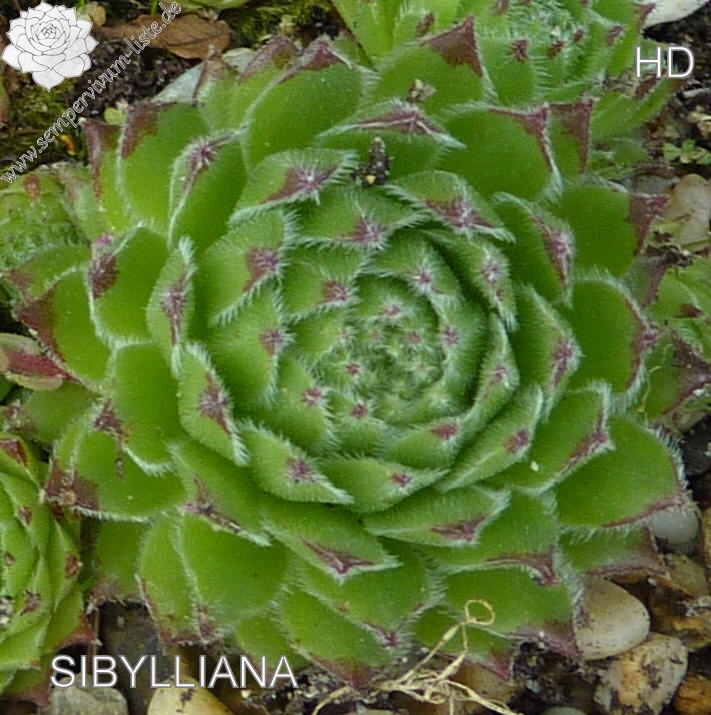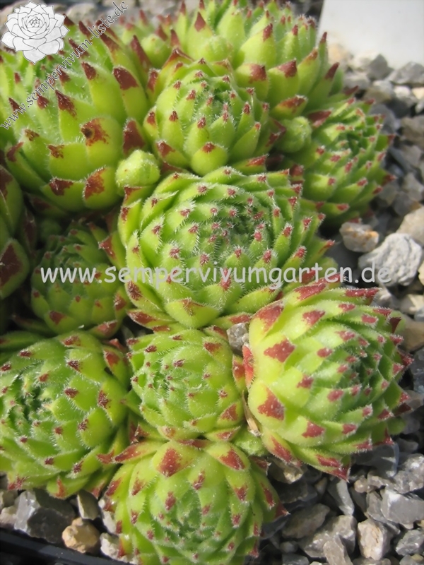 Hier haben wir einen kleinen Hauswurz, der kugelige Rosetten bildet. Besonders schön sind die kleinen roten Blattspitzen.
