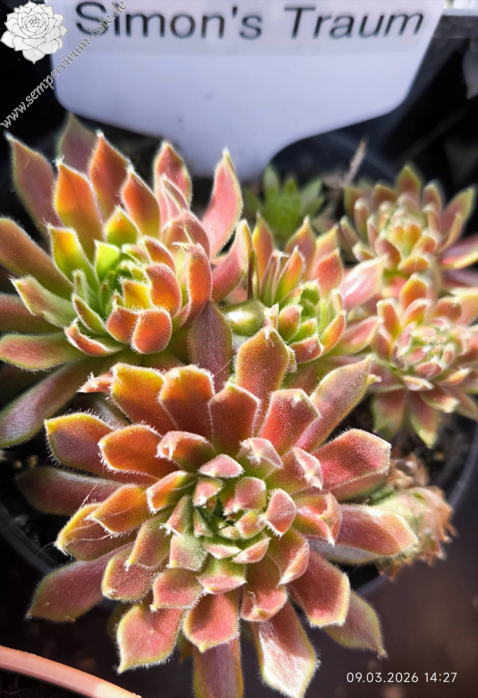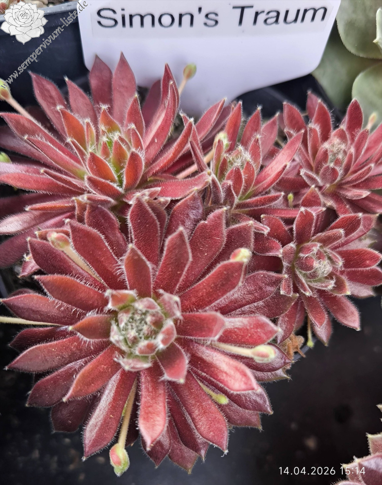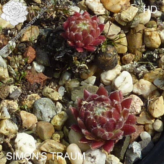 Rosetten 5 - 8 cm groß, weinrot, Blattränder schön bewimpert, Blattspitzen kleine Haarbüschel, behält eine rote Farbe im Winter, wächst schnell, Zufallssämling, benannt nach dem Enkelsohn des Züchters, Simon Schwaldt