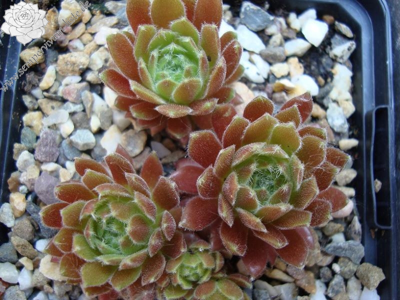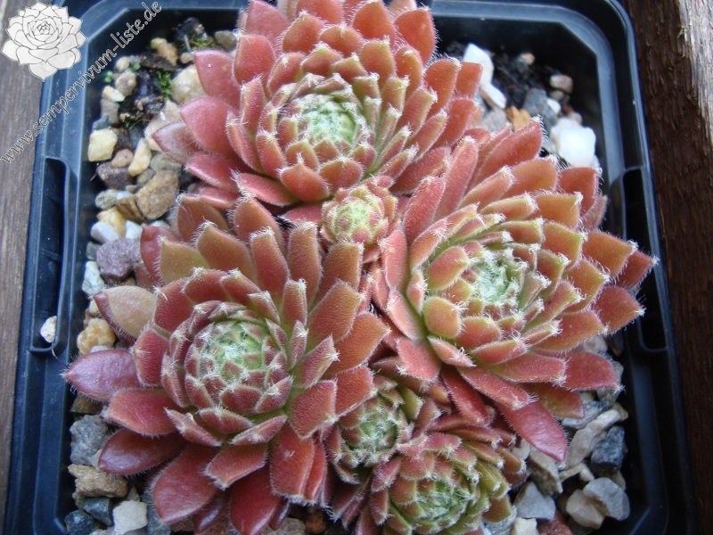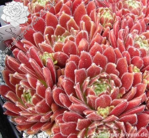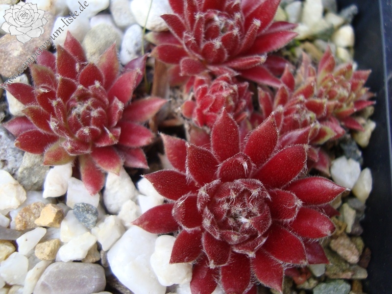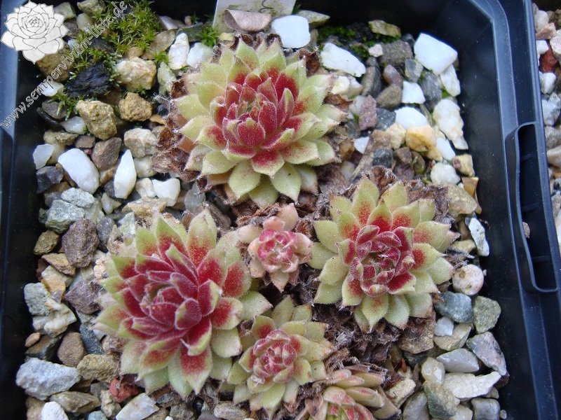Die Rosetten sind für eine Spinnwebhauswurz Hybride mit einem Ø von 5 - 8 cm relativ groß. Die Blätter sind erdbeer- bis weinrot gefärbt. Die Spitzen tragen weiße, kleine Haarbüschel. Ein wüchsiger Sämling aus einem deutschen Garten, der kompakte Polster formt.