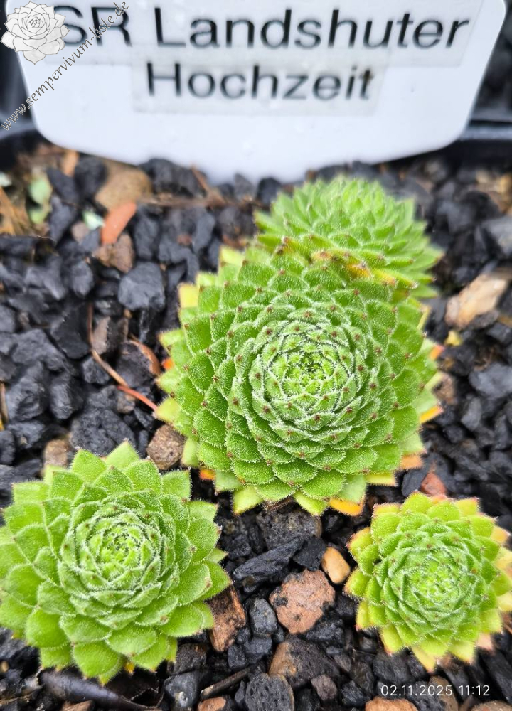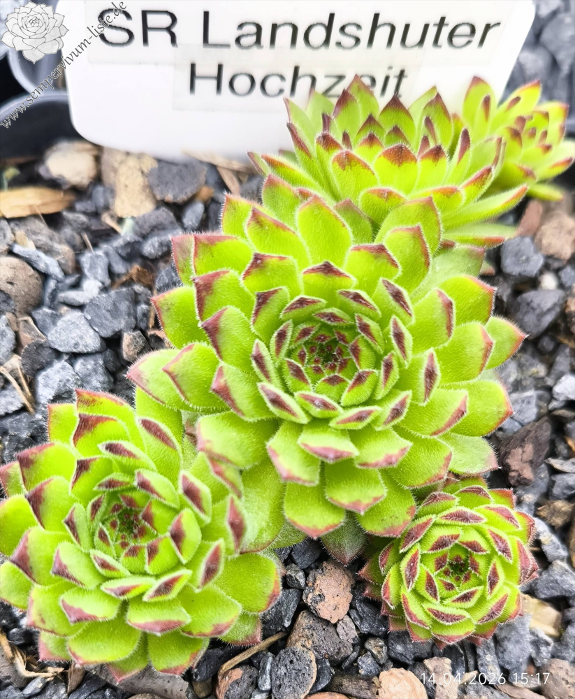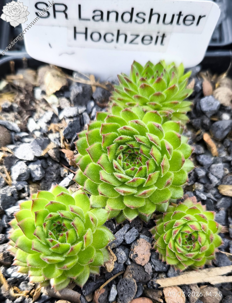 SR Landshuter Hochzeit bildet kleinere, leicht samtige Rosetten und stammt vermutlich von einer S. grandiflorum Mutterpflanze ab. Diesen Zufallssämling von 2021 habe ich fleissigen Insekten zu verdanken. Im Frühling 2023 überraschte er mit rötlich gespitzten Blättern. Die Kindel wachsen symmetrisch aus der Mutterrosette an relativ kurzen Stolonen. Die Pflanze hat keinen harzigen Geruch wie S. grandiflorum, aber gelbe Blüten mit roten Staubfäden. Im Laufe des Sommers verschwinden die roten Spitzen.