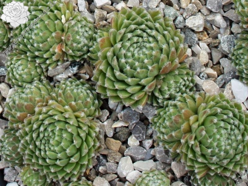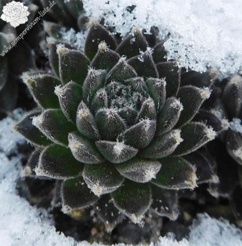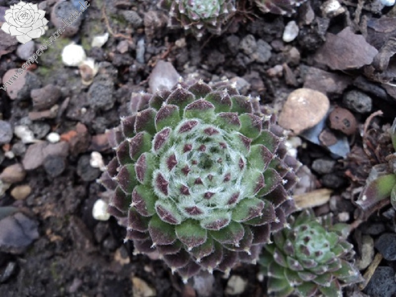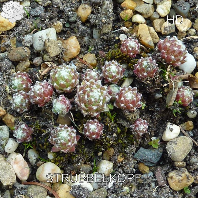Eine weitere Neuheit aus Herrieden: Die Auslese einer Absaat von Sempervivum 'Koko Flanel' formt 4 cm große, stark behaarte Rosetten. Die Blattspitzen wirken wie mit Wattebäuschen besetzt. 'Strubbelkopf' bildet schnell dichte Polster!
