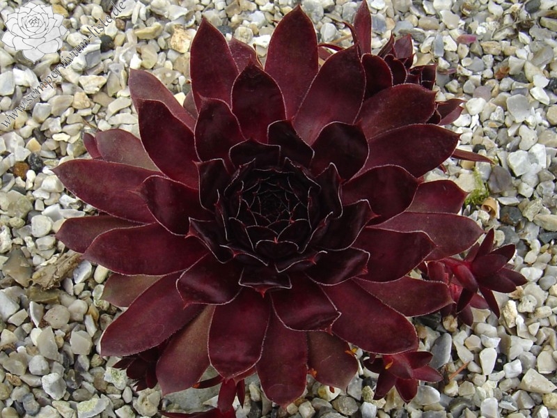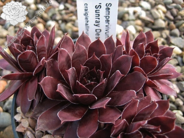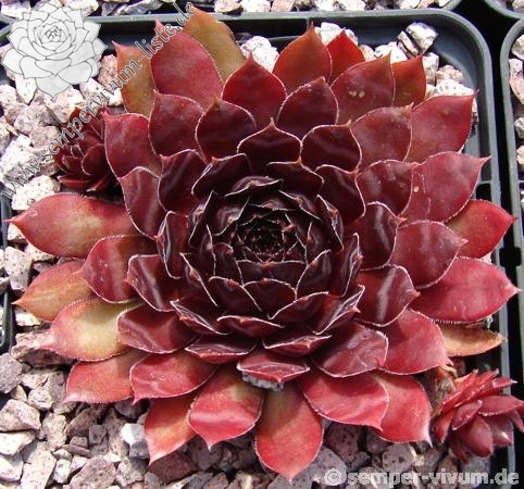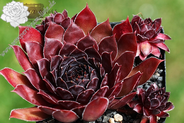 Sempervivum 'Sunray Desire' besitzt größere Rosetten und sprossen gut. Die kräftig dunkelrot gefärbten Pflanzen zeigen tolle Farben. Im Zentrum sind im Sommer sehr dunkle Farben zu sehen, mit einer leicht metallischen Wirkung. Eine tolle Pflanze.