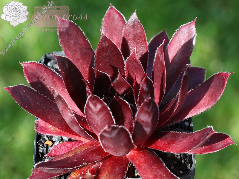 Die mittelgroßen Rosetten zeigen im zeitigen Frühjahr eine sehr dunkle Färbung in Purpur und Violet. Zum Sommer erleuchten sie in kräftigem Rot, während sie sich bis zum Herbst wieder in dunkles Lila verwandeln. Die Blätter sind mit weißen Randwimpern versehen, wodurch bei Sonnenschein ein silbriger Glanz entsteht. Sie gehört zu unseren Lieblingssorten von Sue Thomas zahlreichen Hybriden, die seit einigen Jahren bekannt werden.
