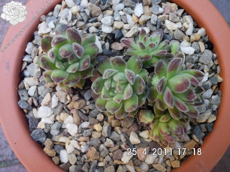 Mittelgroße Rosetten, die leicht samtig sind und eine grüne Grundfärbung besitzen. Schöne dichte Polster!