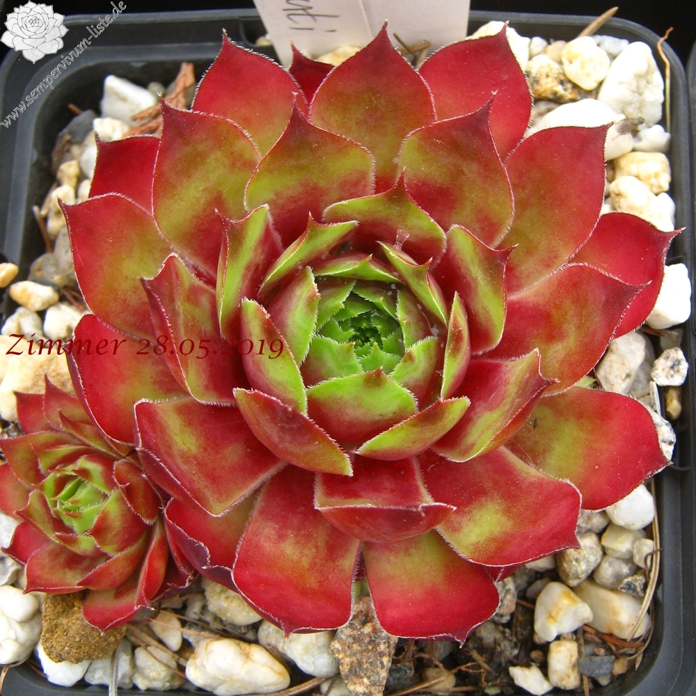 Während der Frühlingsmonate begeistert uns diese großrosettige Züchtung mit auffallend glühenden Rottönen. Zum Sommer vergrünend.