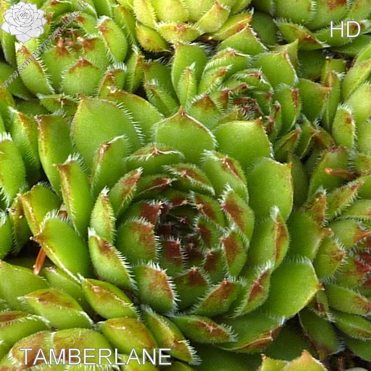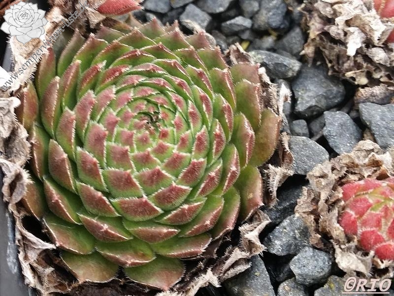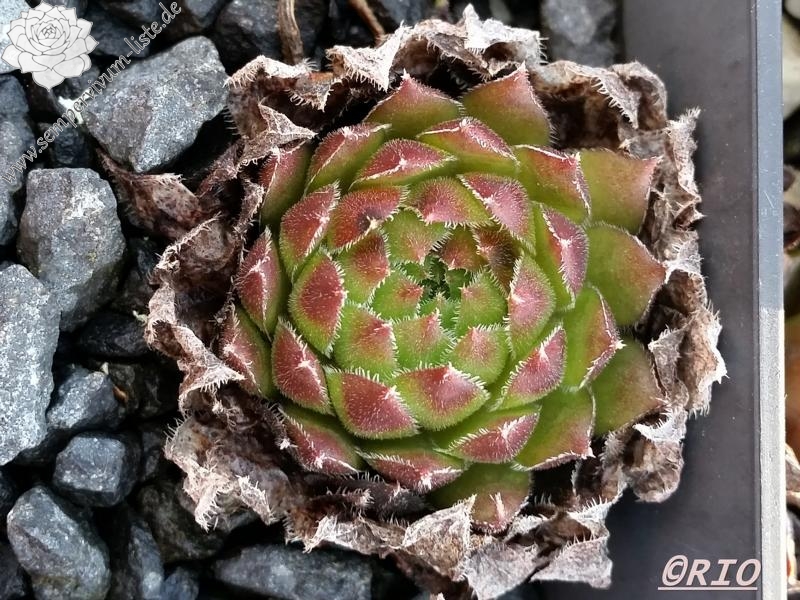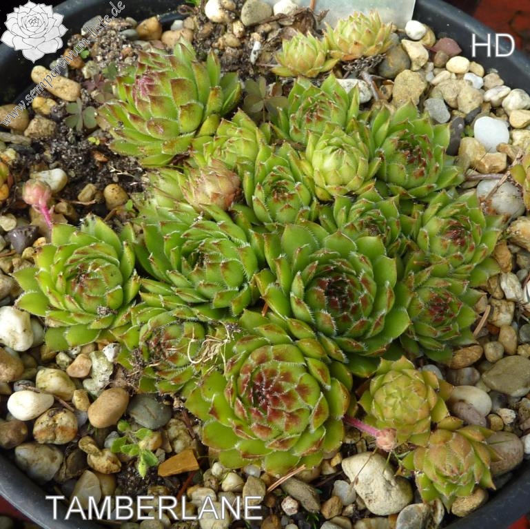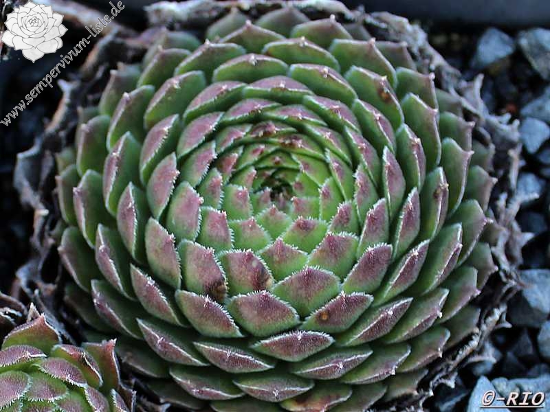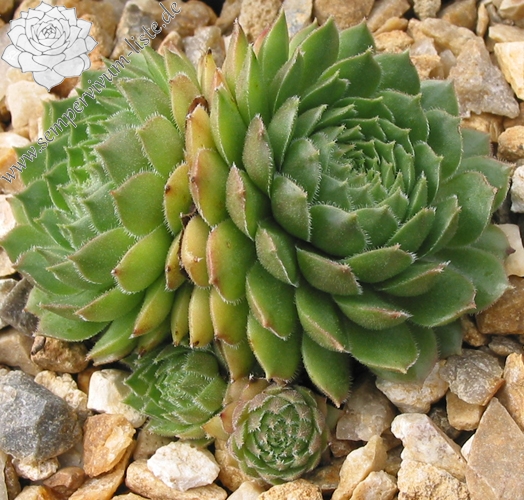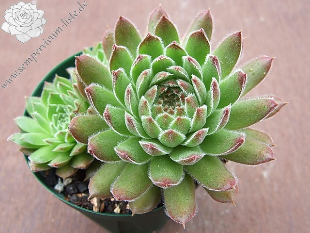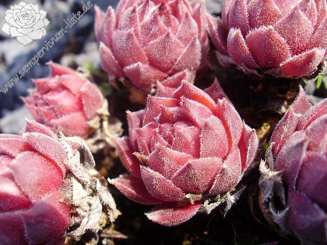 ca. 3 cm große, dichte kugelige Rosetten, braunrot, Mitte grünlich, Blüte 10 cm
