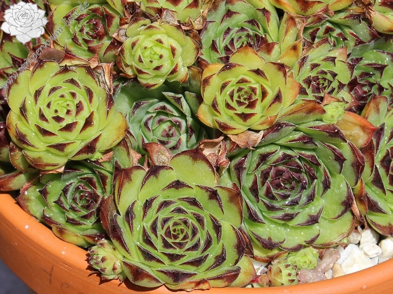 Erwin Geiger: Alle Sempervivum, die in Frankreich vorkommen, wachsen sehr kompakt - die Lokalformen von S. tectorum erinnern sehr an S. calcareum, die früher ja auch zur vorigen Art gestellt wurde; hier erhalten Sie frischgrüne Rosetten mit dunkelbraunen Blattspitzen, die sich dadurch gut abzeichnen.