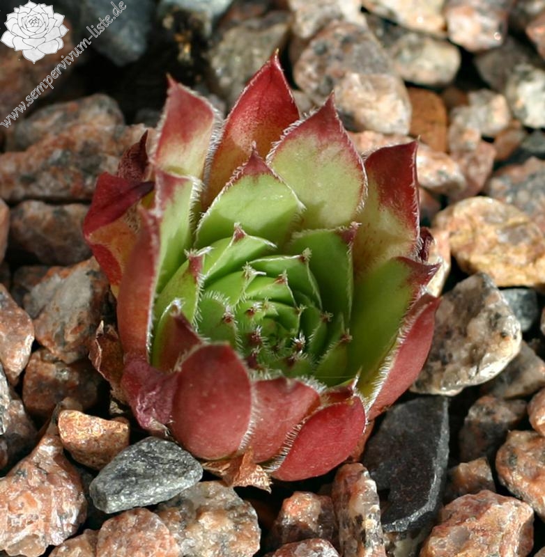 Erwin Geiger: Dieser Klon formt kompakte Tuffs mit relativ spitzen Rosetten, deren Blattenden ganzjährig kräftig rotbraun gefärbt sind. Die Blattränder sind leicht bewimpert.