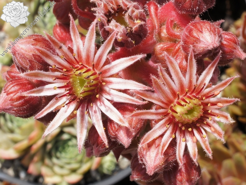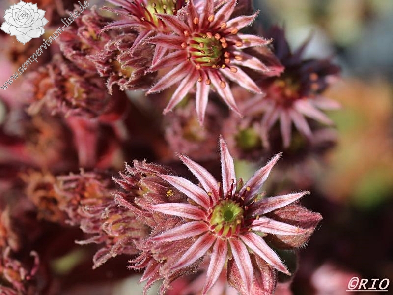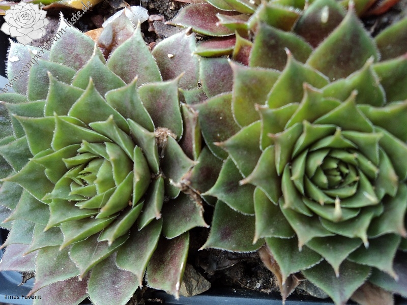 Rosetten 4 - 6 cm groß, innen hellgrün, Blätter rosa braun, Spitzen hellgrün, bildet schnell große Polster, ein Elternteil cv. Seneca, benannt von der Tochter des Züchters, Tina (Bettina) Eggemann