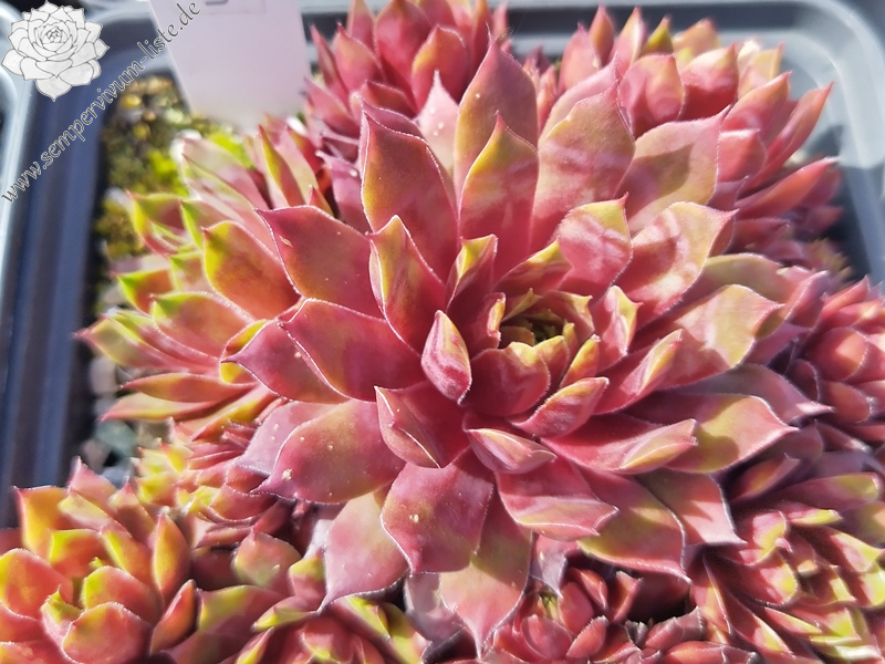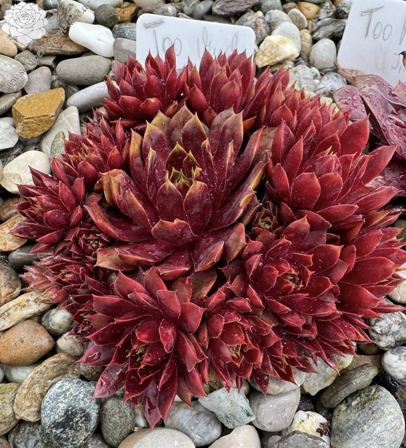 'Too Much' bildet größere Rosetten von ca. 9 cm Größe, mit länglichen sehr fein bewimperten Blättern. Bei Frühlingsbeginn startet sie mit bordeauxroten Blättern, die am Blattgrund beginnen hellrot zu leuchten. Anfang Mai ist sie feuerrot, das Herz zeigt strahlende gelbgrüne Spitzen, die auf der Rückseite leicht marmoriert sind. Die Sommerfärbung wirkt sehr bunt, wie aquarelliert. Das kompakte Herz ist hellgrün und die Blätter werden nach außen hin immer mehr mit einer rosafarbenen Tönung überzogen. Die äußeren feuerroten Blätter recken sich nach oben und erzeugen so eine Flammenwirkung. Auf den Blattspitzen sitzen rote Dornen. Sie ist eine robuste Sorte, vermehrt sich sehr gut und bildet schnell ein größeres Polster, außerdem ist sie frosthart und unempfindlich bei großer Hitze und auch bei langen Regenperioden.