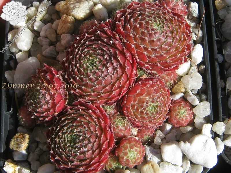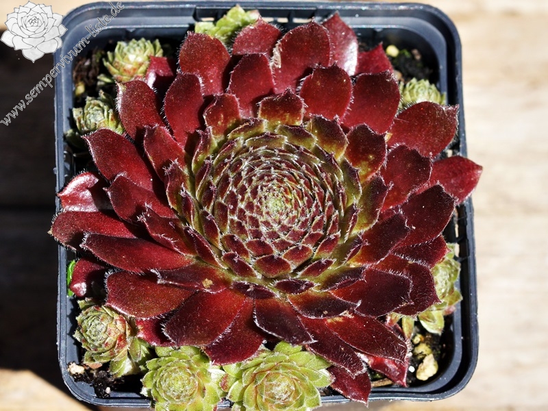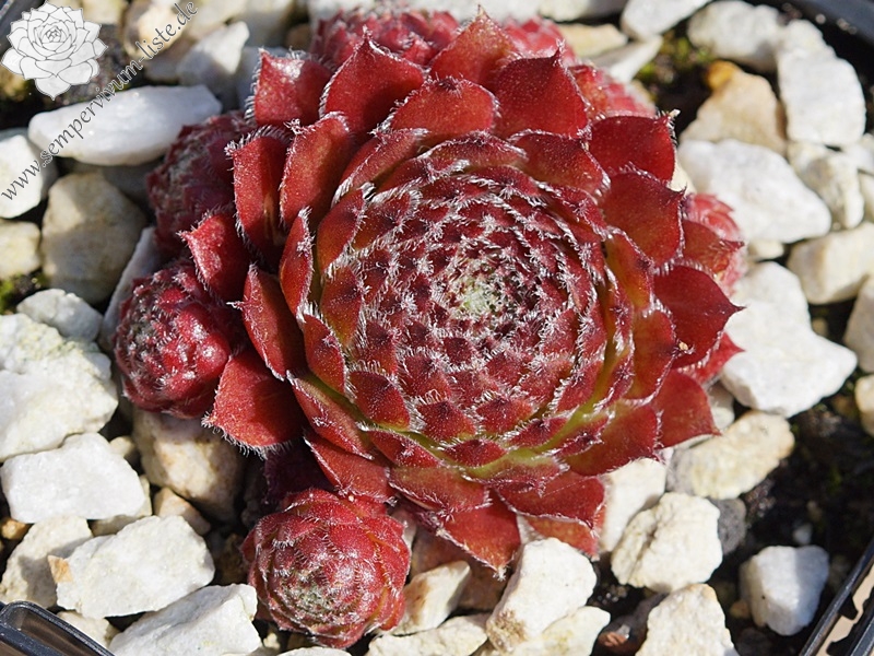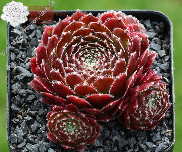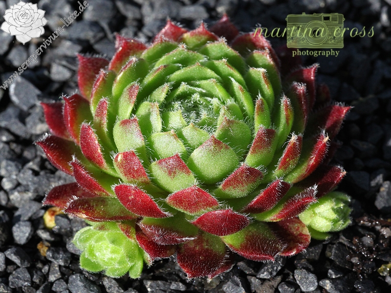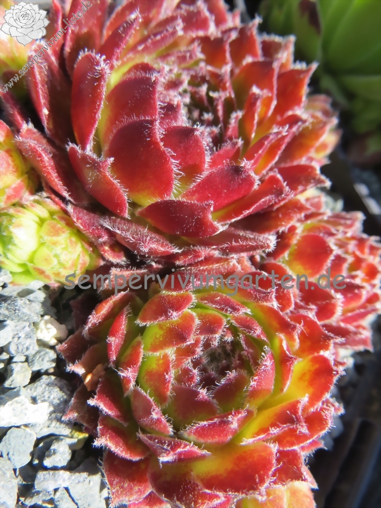 Sempervivum 'Touch of Class' bildet mittelgroße Rosetten. Die breiten Blätter leuchten kräftig rot und besitzen eine leichte weiße Behaarung. Es handelt sich um einen wüchsigen Hauswurz, der willig sprosst.