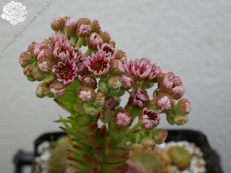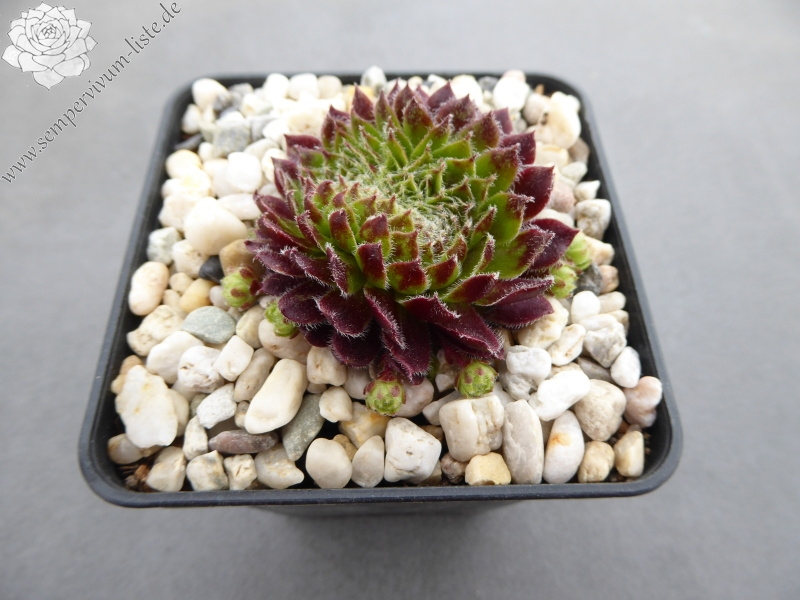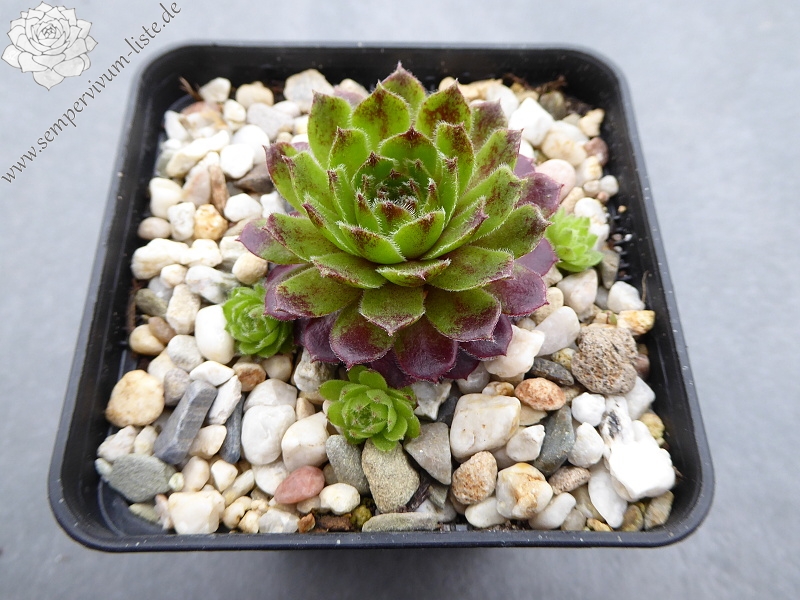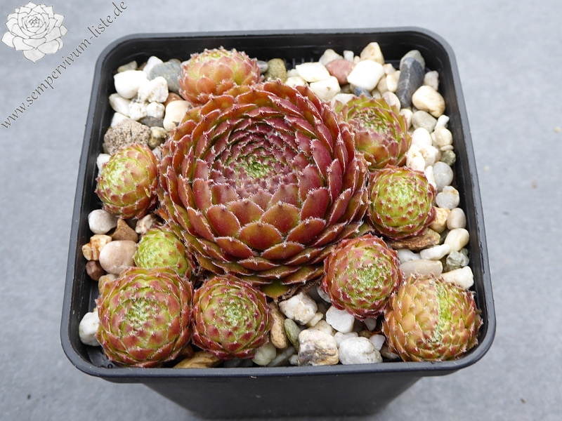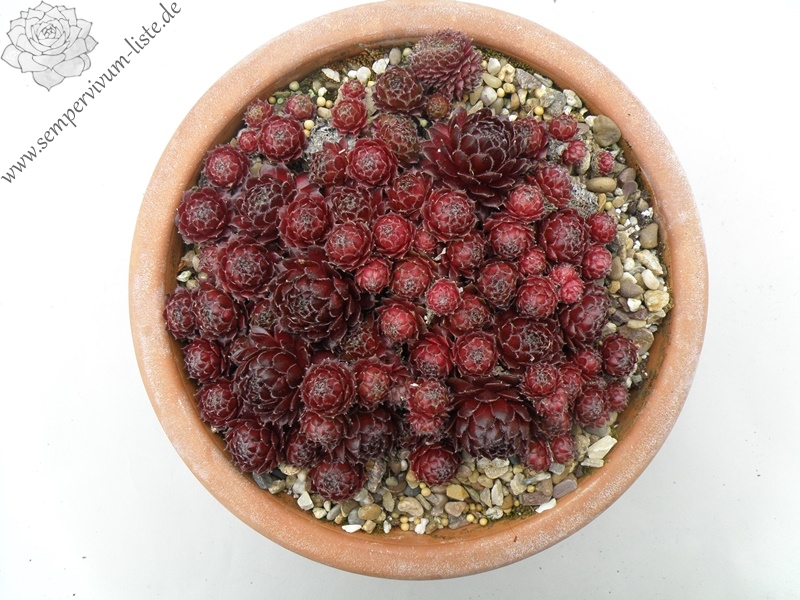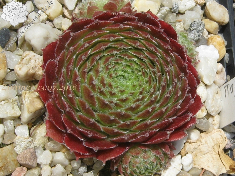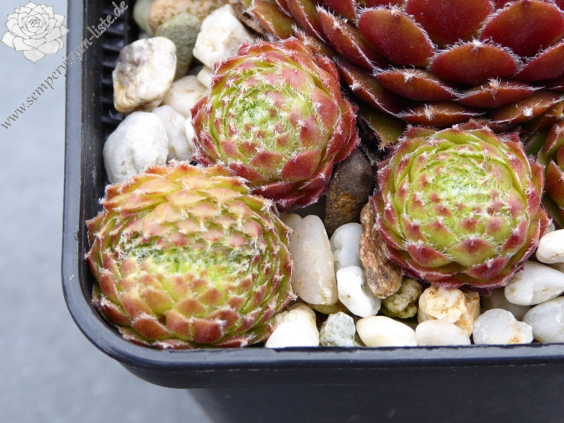 Sempervivum 'Touch of Class' bildet mittelgroße Rosetten. Die breiten Blätter leuchten kräftig rot und besitzen eine leichte weiße Behaarung. Es handelt sich um einen wüchsigen Hauswurz, der willig sprosst.