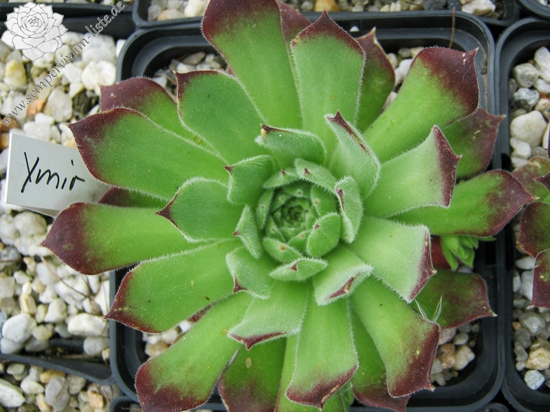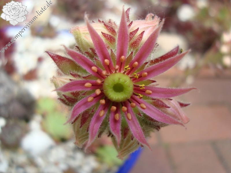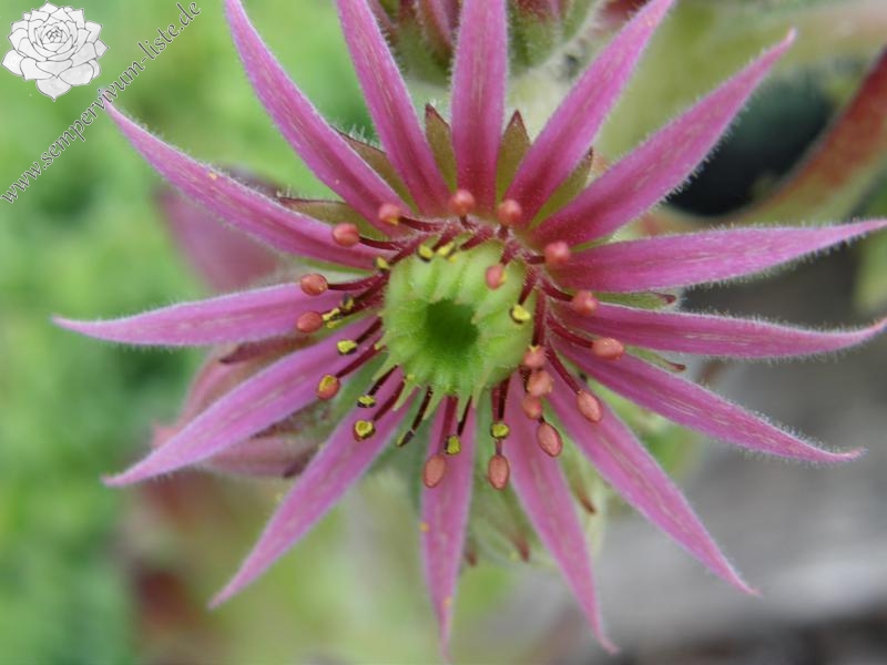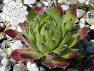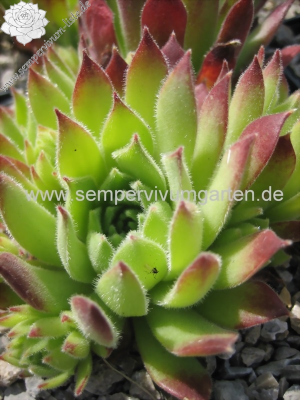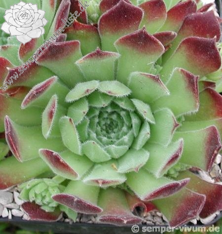 Ein ganz anderer Sämling von S. arachnoideum 'Silberknopf', der einen Durchmesser von 10 cm erreicht! Die Pflanze besitzt einen blass hellgrünen Grundton mit dunkelroten Blattenden, die wie ein roter Ring um die Rosetten wirken. Im Rosettenzentrum zeigen die Blätter nur kleine rote Spitzen, nach außen hin wird der Rotton dann immer stärker und die gefärbten Spitzen auch immer größer. Die äußeren Blätter zeigen bis zu 2,5 cm lange dunkelrote Spitzen. Die Blätter sind leicht flaumig und stehen steil nach oben. Eine gut wachsende und sprossende Hybride, die einen besonderen Reiz besitzt.