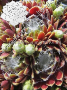 Sempervivum 'Zilver Red Favorit' besitzt besonders leuchtende Farben. Das Rosettenzentrum ist weiß behaart und die äußeren Blätter sind leuchtend orangerot gefärbt. Die Blattränder sind hellgrün gefärbt. Eine wüchsige Pflanze, die schnell dichte Polster bildet. Die Pflanzen fallen besonders im Frühling auf!
