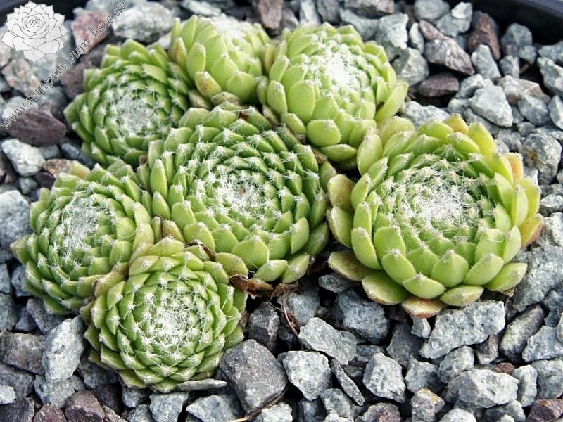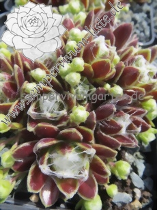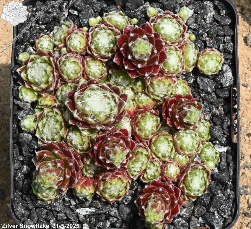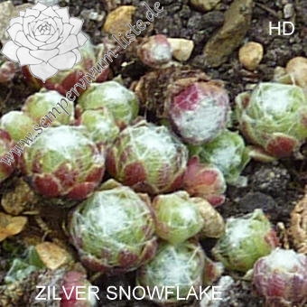 Sempervivum 'Zilver Snowflake' ist ein mittelgroßer Spinnweb-Typ. Das Zentrum ist dicht, weiß behaart. Die roten Rosetten besitzen hellgrüne Blattränder. Die Pflanzen besitzen eine bunte Wirkung.