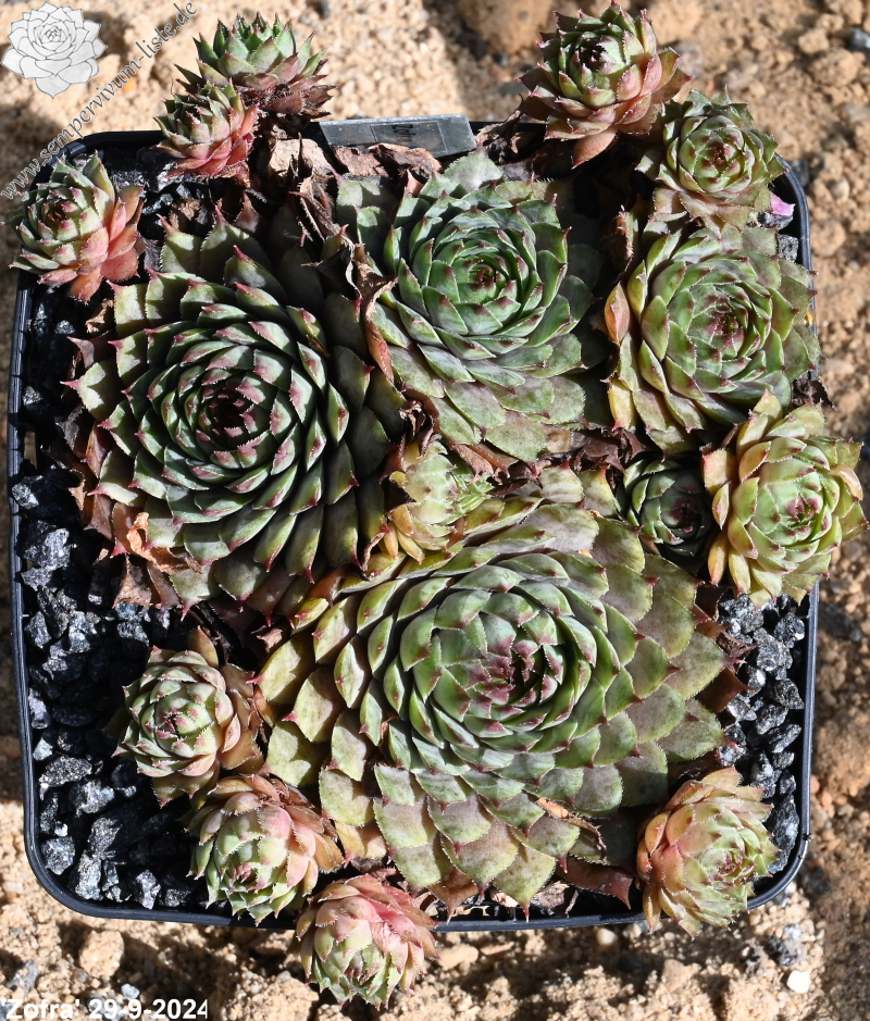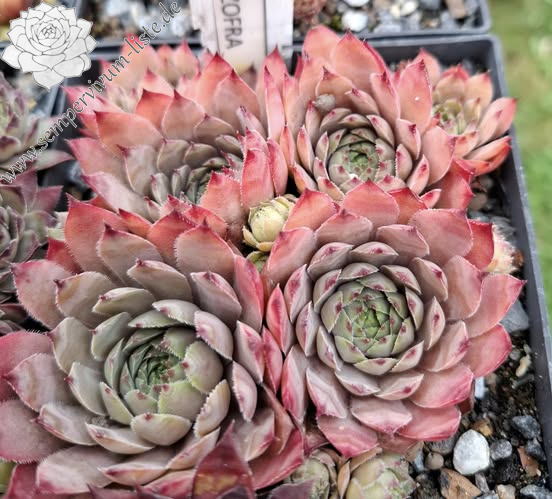 Sempervivum 'Zofra' ist ein mittelgroßer Typ, der sehr helle Farben zeigt. Die dunklen Blattspitzen heben sich deutlich ab.